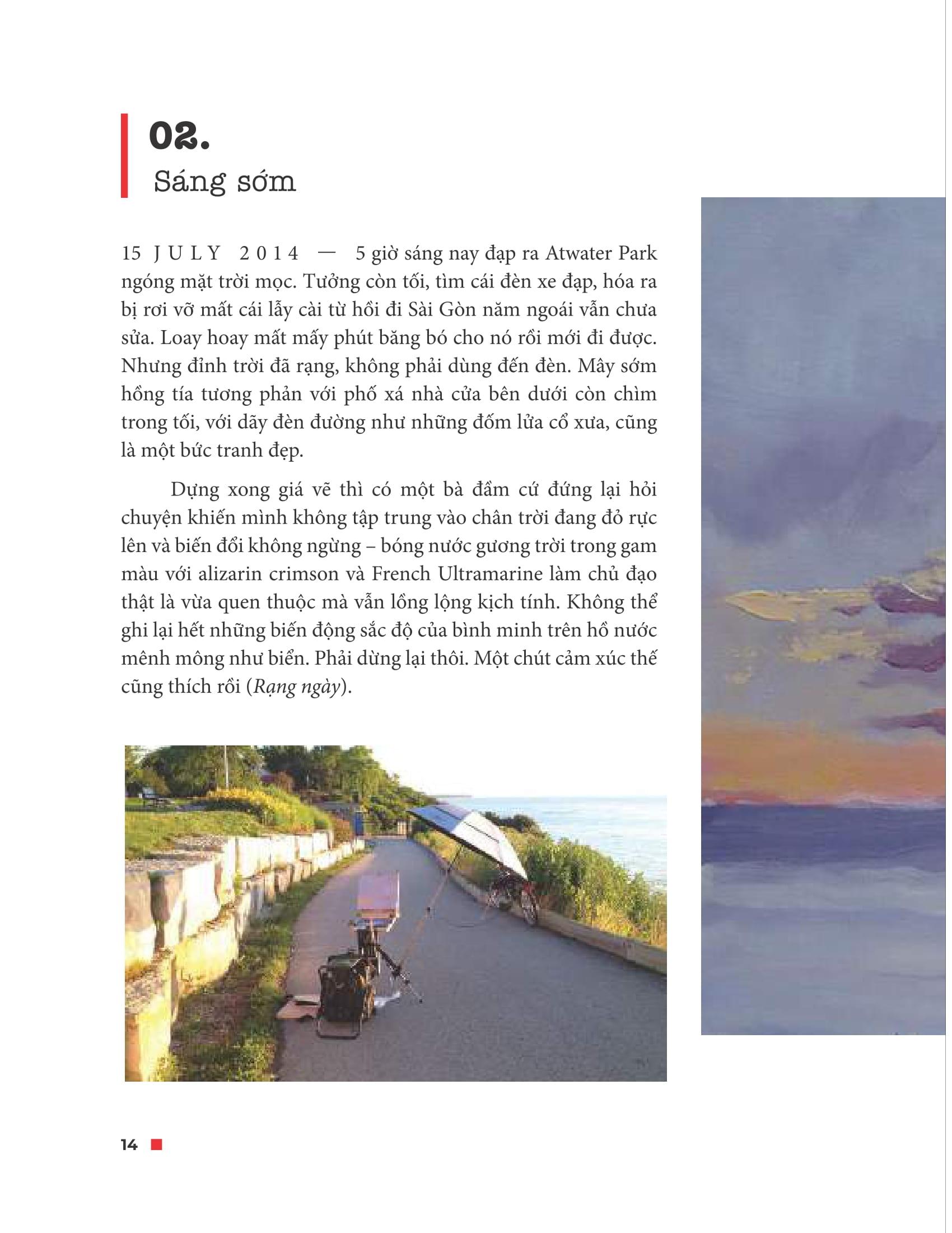 5. Cảm giác thật sảng khoái. Chỉ cần nắm giữ được cái dáng vẻ và màu sắc chung của khung cảnh – mà thực ra là một tổng hợp của những giây phút liên tiếp rất khác nhau. Bóng nước gương trời di chuyển những mảng sáng tối từ chỗ này sang chỗ kia, tùy theo mây tan hợp trôi nổi. Vẽ cảnh đúng là phải nhìn bằng cả sự thông cảm với thiên nhiên, chứ không phải chỉ bằng mắt. Trước hoàng hôn có cái hay là nước hồ bỗng dậy sóng dạt dào chứ không còn im ắng như sau cơn mưa. Và hải âu lại xuất hiện chao lượn như muốn níu kéo nắng đang mỗi lúc một óng ánh vì tương phản với bóng tối đang sắp đến chứ không còn toàn quyền bao phủ chan hòa vạn vật nữa. (tr. 36)