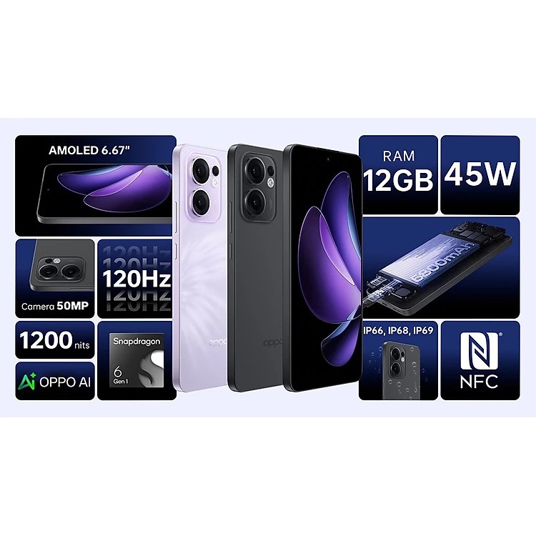 Điện Thoại Oppo A3 8GB/128GB - Hàng Chính Hãng Bộ sản phẩm bao gồm: Thân máy, sạc, cáp USB, dụng cụ lấy sim, vỏ bảo vệ, sách hướng dẫn. Hiển thị tinh tế - Sở