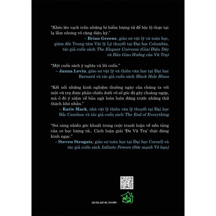 “Soi sáng nhiều góc khuất trong cuộc tranh luận về nền tảng của cơ học lượng tử Cách luận giải Đa Vũ Trụ thật đáng kinh ngạc.” - Steven Strogatz, giáo sư toán học tại Đại học Cornell và tác giả cuốn sách Infinite Powers (Sức mạnh Vô hạn)