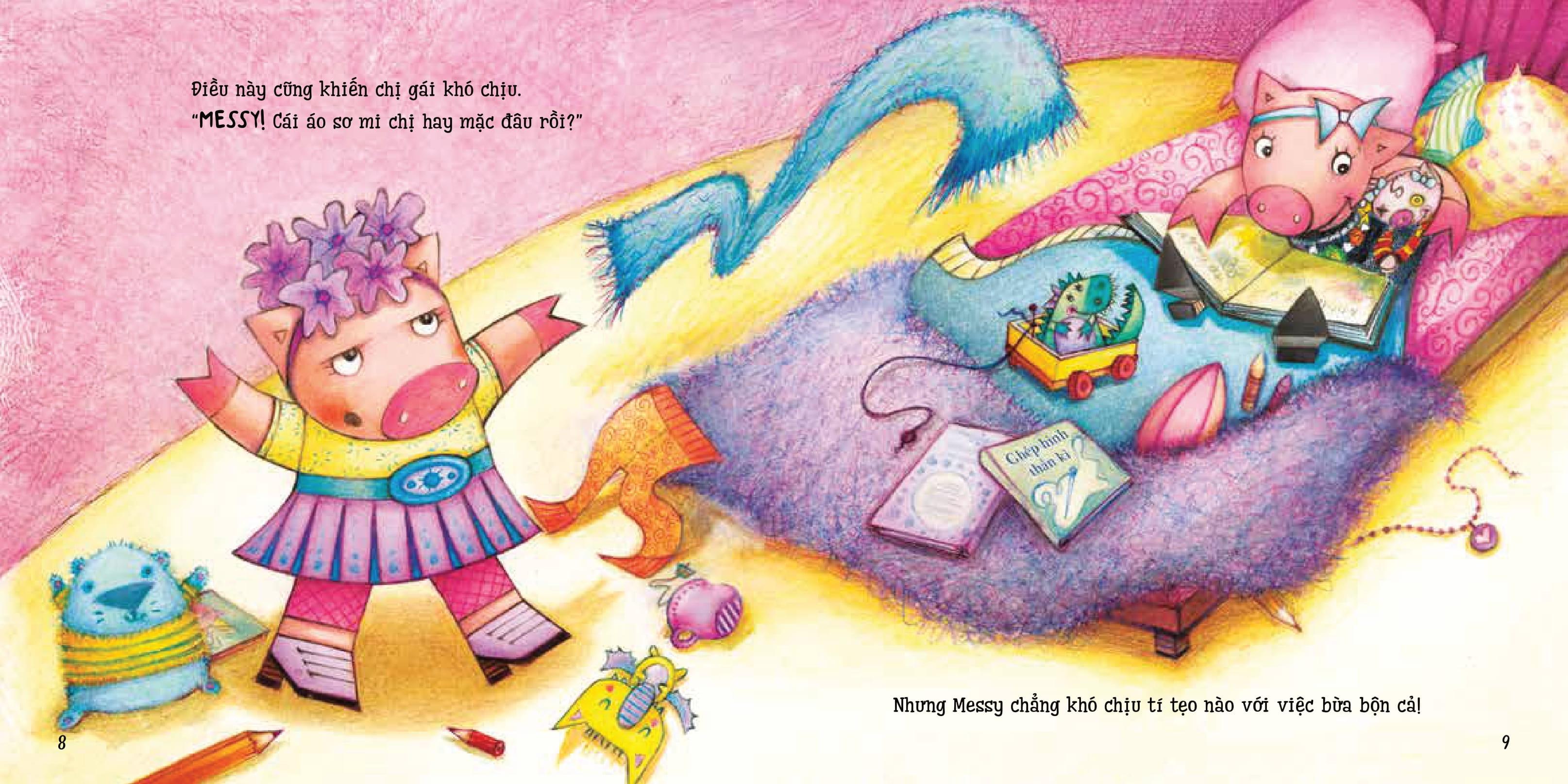 Cuốn “Dọn gọn gàng, ngăn nắp” kể về cô bạn lợn nhỏ Messy vô cùng bừa bộn, trong phòng đồ chơi quẳng khắp nơi, quần áo không chịu dọn… thế nên khi chiếc vòng cổ yêu thích bị thất lạc thì cô bé không biết tìm ở đâu. Liệu bạn Messy có tìm thấy chiếc vòng không nhỉ? Và liệu sau vụ này, bạn ấy có gọn gàng, ngăn nắp hơn không?