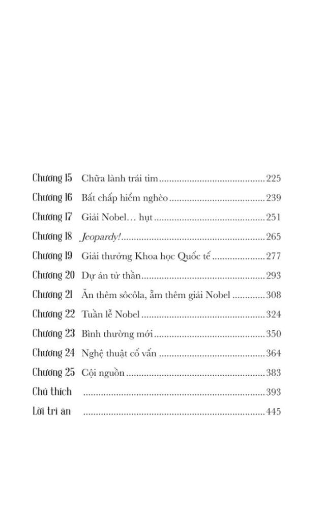 Với những tiết lộ hấp dẫn xoay quanh giải thưởng Nobel, những câu chuyện cá nhân sâu sắc của những nhà khoa học nổi tiếng, mười quy tắc vàng để trở thành người cố vấn tài giỏ đây chính là một cuốn sách tràn ngập những giai thoại và năng lượng, đồng thời cho chúng ta cái nhìn thoáng qua về cuộc đời của một trong những nhà khoa học hàng đầu thế giới.