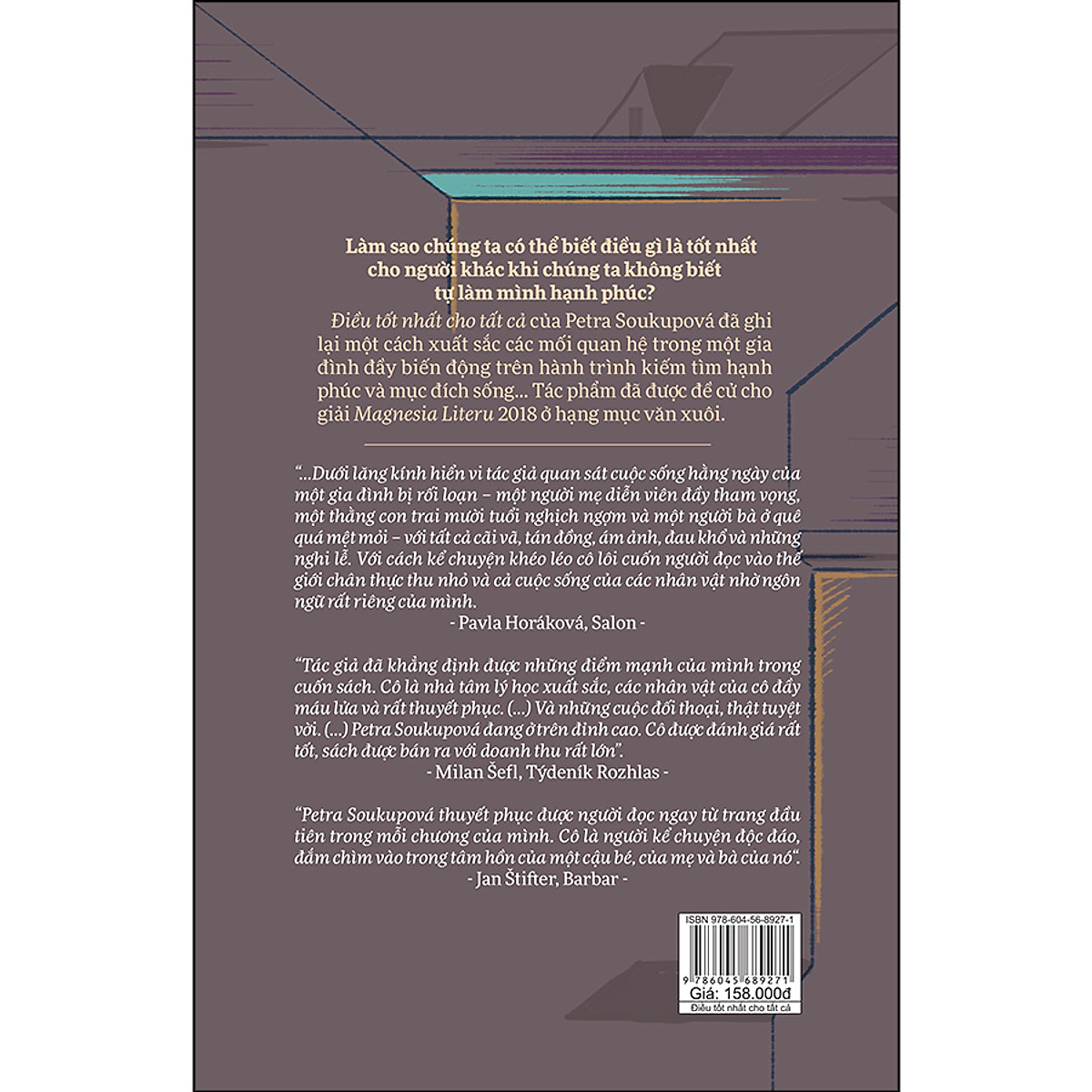 Thông tin sản phẩm Mã hàng 9786045689271 Tên Nhà Cung Cấp Phụ Nữ Tác giả Petra Soukupová Người Dịch Hau Phamová NXB NXB Phụ Nữ Việt Nam Năm XB 2020 Ngôn Ngữ Tiếng Việt Trọng lượng (gr) 400 Kích Thước Bao Bì 23.5 x 15.5 x 2.1 cm Số trang 436 Hình thức Bìa Mềm   Làm sao chúng ta có thể biết điều gì là tốt nhất cho người khác khi chúng ta không biết tự làm mình hạnh phúc?   Viktor, cậu bé mười tuổi chuyên gây rối, sống ở thủ đô Praha với mẹ Hana - một nữ diễn viên nhà hát. Hana là một phụ nữ xinh đẹp, tài năng nhưng sự cố mang thai ngoài ý và trở thành mẹ đơn thân ở tuổi 20 đã khiến cuộc sống của cô khá bề bộn. Là một nghệ sĩ sống thiên về bản năng, Hana chẳng biết mấy về chuyện nuôi dạy con, và luôn loay hoay trong các mối quan hệ tình ái mà chẳng có cái kết tốt lành. Sau khi người mẹ nhận được lời mời quay bộ phim dài tập, cô cho đó là một cơ hội để giải quyết vấn đề của mình. Cô đưa Viktor về nông thôn ở với bà ngoại và tự cho đó là việc thay đổi môi trường, như thế sẽ tốt hơn cho cậu bé, và bà Eva (mẹ cô) sẽ không phải ở một mình. Nhưng Viktor lại cảm thấy bị tổn thương và tuyệt vọng vì bà ngoại rất mạnh mẽ và cương quyết. Trong khi đó bà Eva phải chống chọi với bệnh tật khi tuổi già ập đến mà cố giấu con cái. Còn Hana thì quay cuồng giữa công việc, cơn „say nắng” điên cuồng với người đàn ông hàng xóm đã có gia đình và những cuộc xung đột vô tiền khoáng hậu với mẹ và anh trai mì   Với bút pháp tự sự „đồng hiện” độc đáo – mỗi sự việc, sự kiện đều được khắc họa đồng thời qua ba „lăng kính” Victor, Hana, bà Eva - Điều tốt nhất cho tất cả của Petra Soukupová đã ghi lại một cách xuất sắc các mối quan hệ gia đình đầy kịch tính và những trải nghiệm của người hùng tí hon vào thời điểm phải nếm mùi bất lực của mình trong thế giới của người lớn; đồng thời nó cũng phản ánh hành trình không mấy suôn sẻ của những người lớn trong công cuộc kiếm tìm mục đích sống và hạnh phúc riêng cho mình.   Điều tốt nhất cho tất cả đã được đề cử cho giải Magnesia Literu – giải thưởng văn chương danh giá của Séc năm 2018 ở hạng mục văn xuôi. Cuốn sách cũng nhận được rất nhiều lời khen ngợi, đánh giá cao từ các nhà phê bình.   Nhà phê bình Milan Šefl viết: “Tác giả đã khẳng định được những điểm mạnh của mình trong cuốn sách. Cô là nhà tâm lý học xuất sắc, các nhân vật của cô đầy máu lửa và rất thuyết phục. (…) Và những cuộc đối thoại, thật tuyệt vời. (…) Petra Soukupová đang ở trên đỉnh cao. Cô được đánh giá rất tốt, sách được bán ra với doanh thu rất lớn”.   Nhà phê bình Jakub Kára tin tưởng: “Bằng cuốn sách mới Petra Soukupová giữ được vị trí của mình như một nhà viết tiểu thuyết xuất sắc về những tổn thương trong con người của mỗi chúng ta. Lại một lần nữa cô chứng tỏ được khả năng viết những đoạn hội thoại xuất sắc và hơn nữa cô tạo ra những nhân vật trong cuộc sống mà người đọc mãi mãi không thể chấp nhận hoặc đồng cảm, nếu muốn.()”   Nhà phê bình Ľubomír Jaško nhận định: “Nhà văn tài năng Séc sẽ không làm bạn thất vọng. Cô vẫn là một nhà quan sát tuyệt vời các mối quan hệ. Cô viết một cách tiết kiệm và chính xác. Những lời thoại trong sách của cô không giả tạo như trong những bộ phim không thành cô”   Còn nhà phê bình Jan Štifter lại cho rằng: „Petra Soukupová thuyết phục được ngay từ trang đầu tiên trong mỗi bài viết của mình. Cô là người kể chuyện độc đáo, đắm chìm vào trong tâm hồn của một cậu bé, của mẹ và bà của nó.”   Tác giả:   Petra Soukupová, sinh năm 1982, là một trong những nhà văn, nhà viết kịch và biên kịch Séc đương đại thành công nhất. Cô đã xuất bản năm cuốn sách cho người lớn và ba cuốn sách cho trẻ em. Cô nhận được một số giải thưởng và đề cử, như Giải thưởng chính Magnesia Litera 2010 ở hạng mục Sách của năm cho cuốn Biến mất; Giải thưởng Jiří Orten 2008 cho tác phẩm đầu tay Ra biển. Sách của cô thường xuyên được xếp hạng trong danh sách bán chạy nhất, và được dịch sang nhiều ngôn ngữ khác.   Dịch giả:   Hau Phamová, sinh năm 1968 tại Hải Phòng, hiện sống tại Praha, Cộng hòa Séc. 1985 - 1986 học ngôn ngữ Séc tại Đại Ngoại ngữ Hà Nội; 1986-1993: học thạc sĩ, Đại học Charles, Prague; 1993: nhận bằng thạc sĩ Hóa học (M.S), Đại học Charles, Prague, Séc. Hiện là phiên dịch viên tòa án được cấp phép và giảng viên bộ môn Việt Nam học (tại Đại học Charles và các trung tâm ngoại ngữ khác).