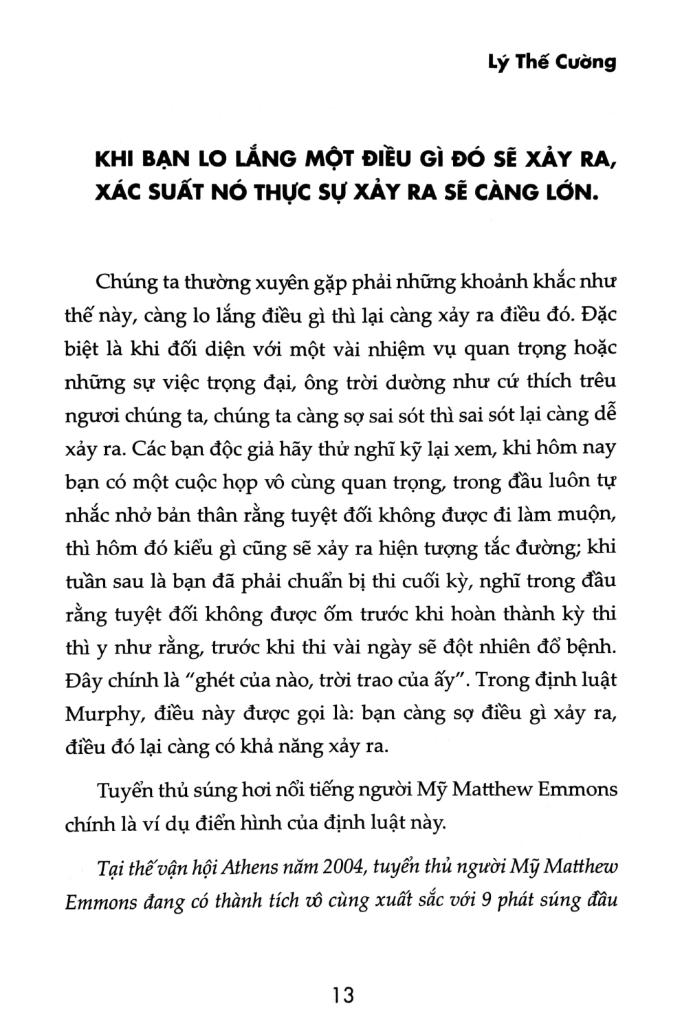Cuốn sách Định Luật Murphy - Làm Sao Để Những Việc Bạn Lo Lắng Sẽ Không Xảy Ra của tác giả Lý Thế Cường, sẽ giúp chúng ta “giải phẫu” cặn kẽ sức ảnh hưởng mạnh mẽ của định luật Murphy trên mọi phương diện trong đời sống – xã hội, từ các góc độ khác nhau, thông qua những ví dụ đơn giản, dễ hiểu, giúp mỗi độc giả lĩnh hội được tinh hoa của định luật này một cách nhẹ nhàng thoải mái nhất, từ đó giúp nâng cao tinh thần cảnh giác đối với các sai lầm, giúp phá vỡ những tảng đá ngáng đường khiến con đường trở nên bằng phẳng, đưa bạn đến với tương lai tươi sáng hơn.