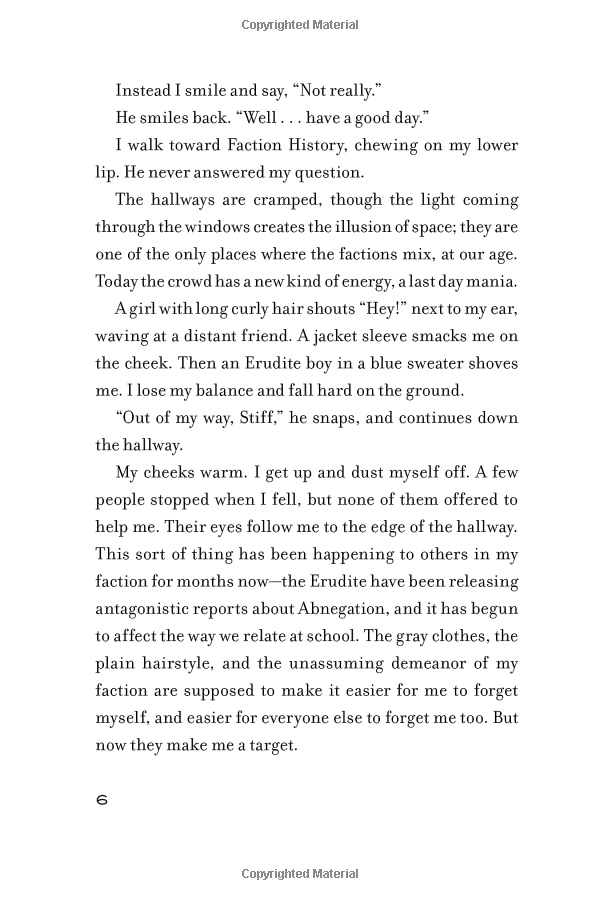 Roth: All the advantages I see only seem like advantages to me because I live in our current society. For example, the members of their society don’t focus on certain things: race, religion, sexual orientation, political affiliation, etc. I mean, a world in which you look different from the majority and no one minds? That sounds good to me. But when I think about it more, I realize that they’re doing the exact same thing we do, but with different criteria by which to distinguish ourselves from others. Instead of your skin color, it’s the color of your shirt that people assess, or the results of your aptitude test. Same problem, different system.