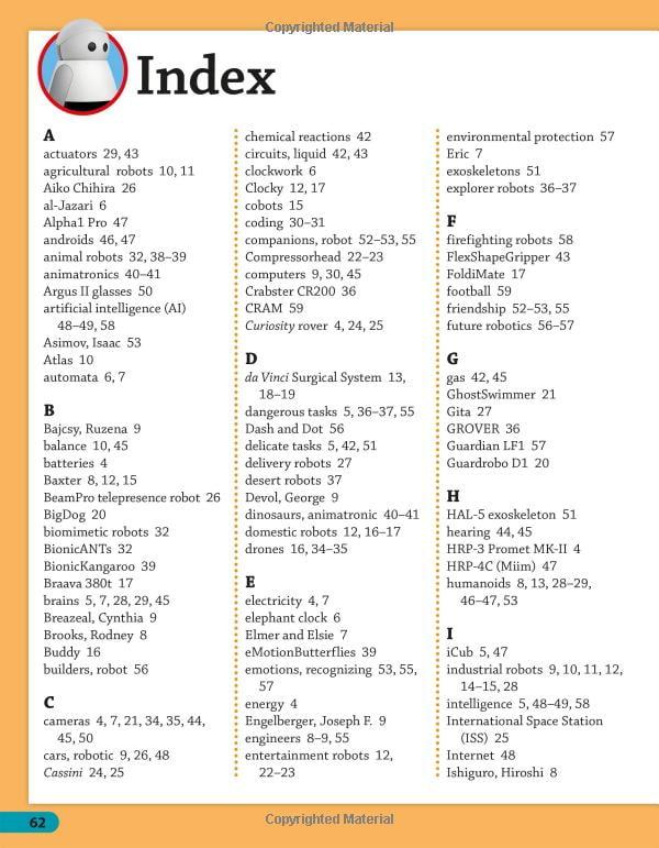 Find out why and how robots are made, how they help humans and what they will do in the future. DKfindout! Robots is packed with up-to-date information, fun quizzes and incredible images of robots. Written by an expert in the field, this book is a great addition to any home library, school's robotics club book list, and classroom's STEAM (Science, Technology, Engineering, Arts, and Mathematics) library