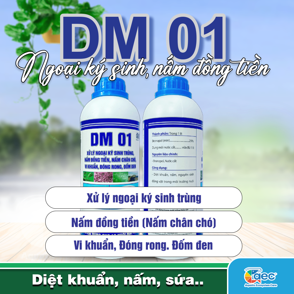 DM 01 là sản phẩm chuyên biệt giúp kiểm soát nấm đồng tiền, ngoại ký sinh và vi khuẩn trong ao nuôi tôm cá. Với hoạt chất Bronopol, DM 01 giúp cải thiện môi trường nước, bảo vệ sức khỏe tôm, nâng cao hiệu quả nuôi trồng thủy sản.