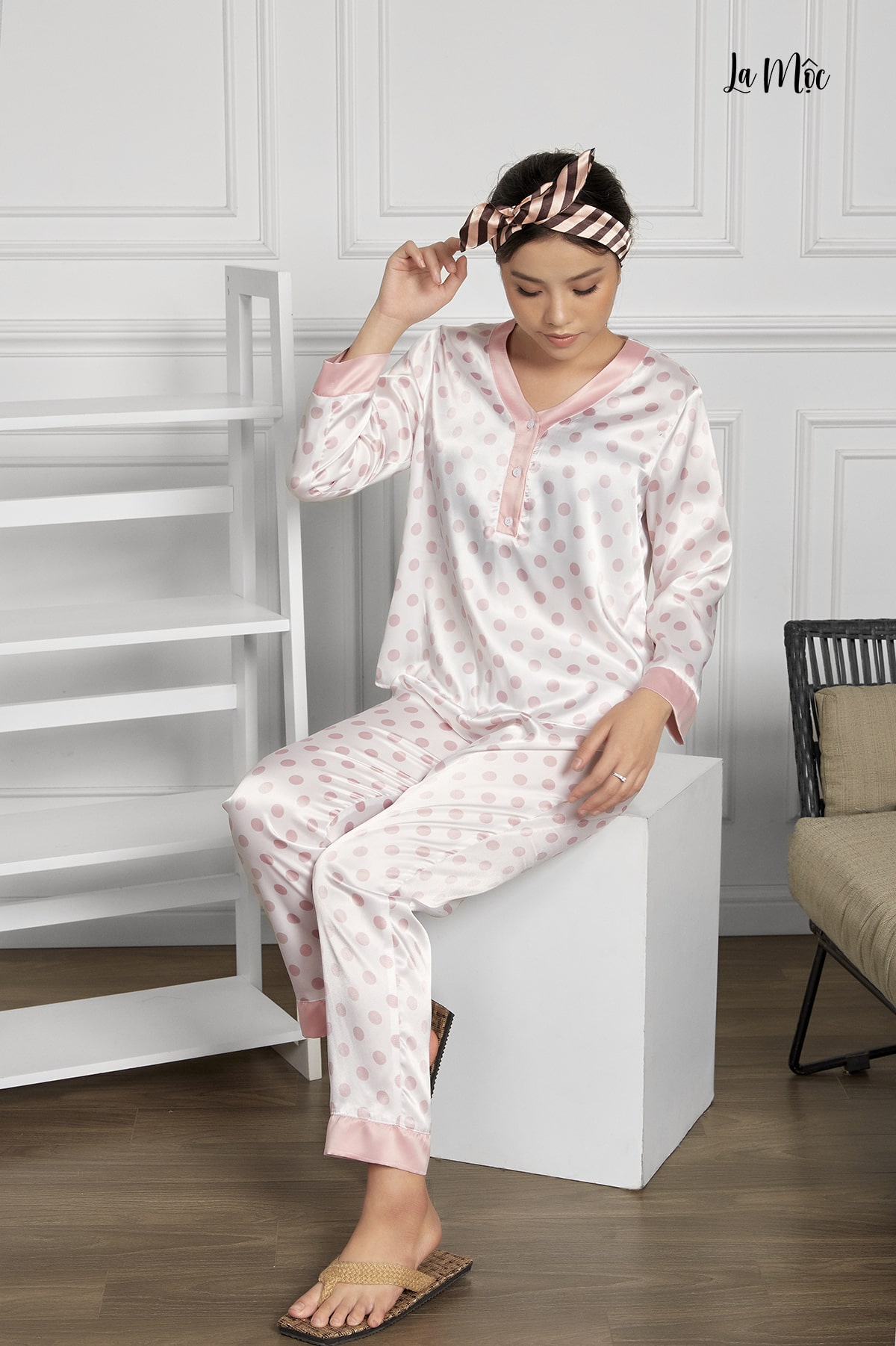 Bộ mặc nhà màu trắng họa tiết chấm bi, tay dài, quần dài, tạo sự kín đáo, vẫn giữ được nét đẹp nhẹ nhàng cho người mặc - LA MỘC chất liệu vải SATIN LỤA.