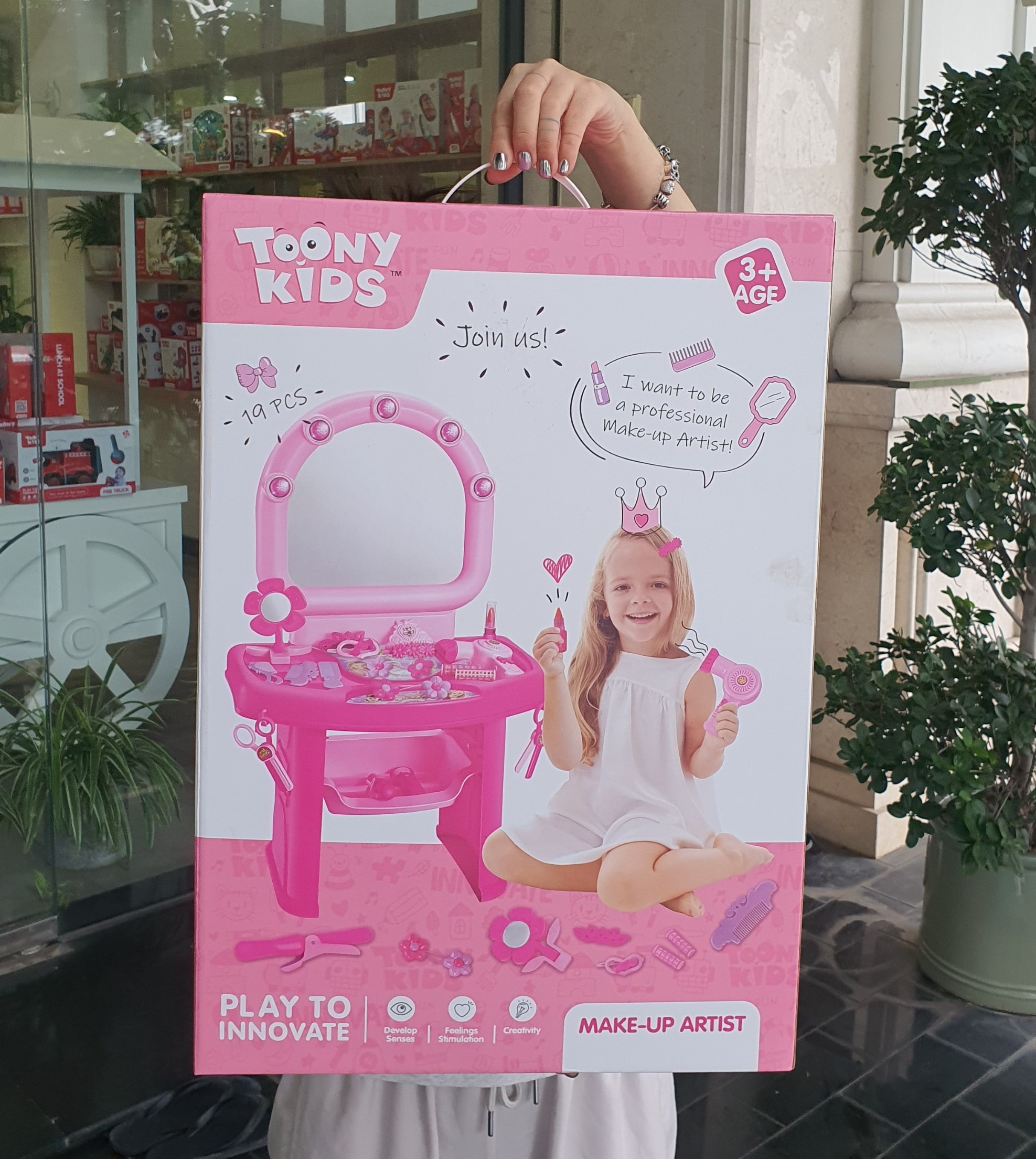- Bộ bàn trang điểm Toonykids - Makeup Artist là món đồ chơi rất được các bé gái ưa thích, với màu hồng dễ thương cùng họa tiết hoa văn hết sức đáng yêu mang đến sự lộng lẫy cho bé yêu, như một nàng công chúa kiêu kỳ ngồi trang điểm trong thế giới cổ tích.