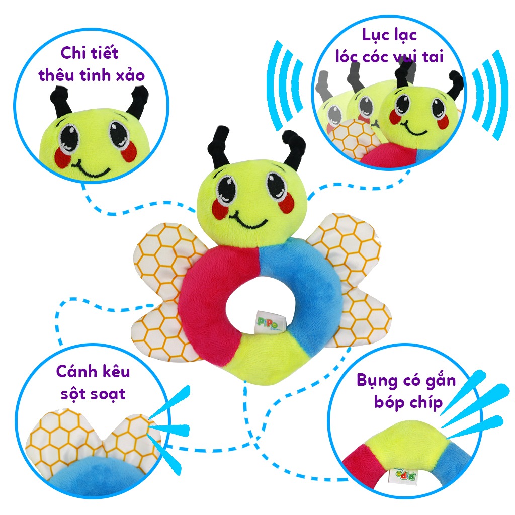 - Lục lạc chuông lớn tạo tiếng kêu leng keng giúp kích thích thính giác thu hút bé khi chơi. Ngoài ra trên lục lạc còn có tiếng kêu sột soạt của màng nylon, tiếng bóp chíp ở bụng lục lạc.