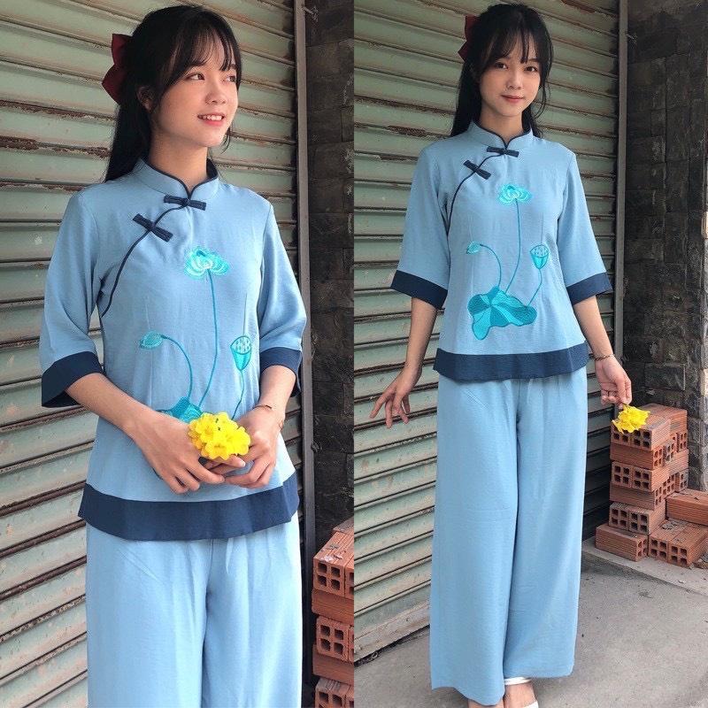Đồ lam đi chùa cổ tàu thêu sen 185k - quần áo Phật tử nữ đẹp HN HCM - Pháp phục Sen Hồng 0898553583
