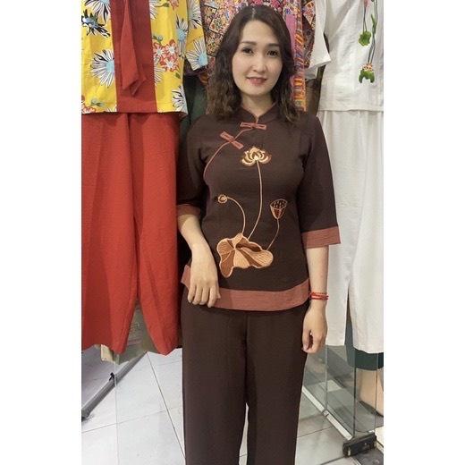 Đồ bộ đi chùa vải đủi vân may thêu hoa sen và chữ AN