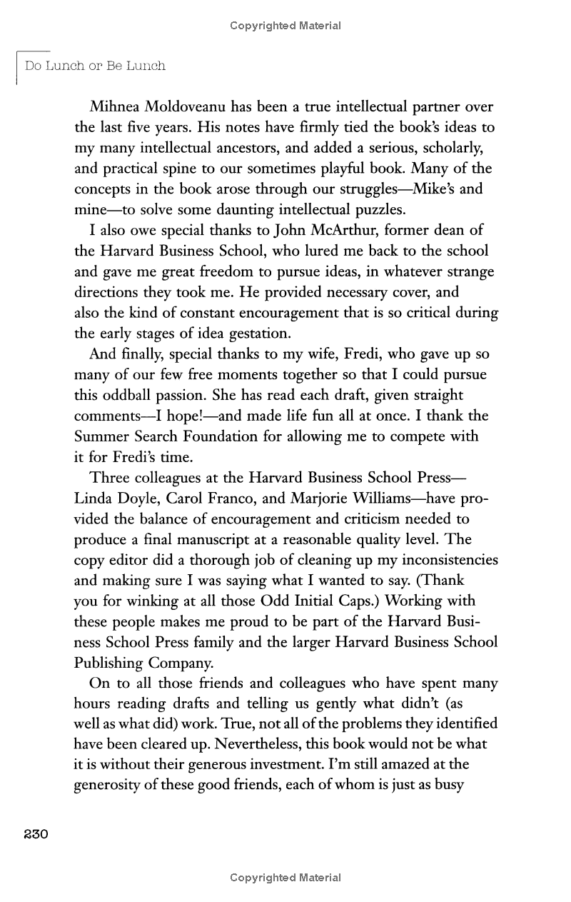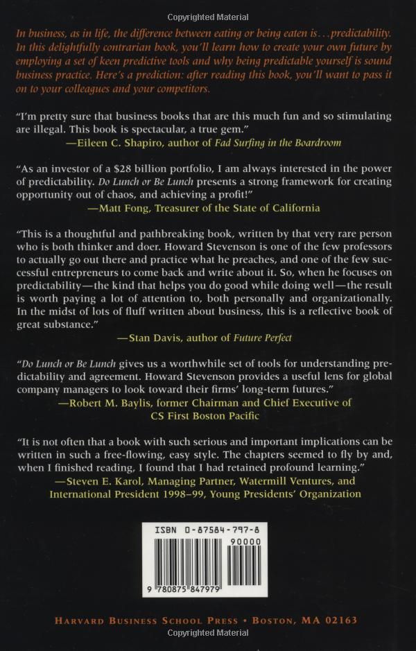 Here is a refreshing antidote to the change manifestos and reinvention tracts that currently crowd the business bookshelves. Do Lunch or Be Lunch is a provocative argument for predictability as the most powerful of management tools.