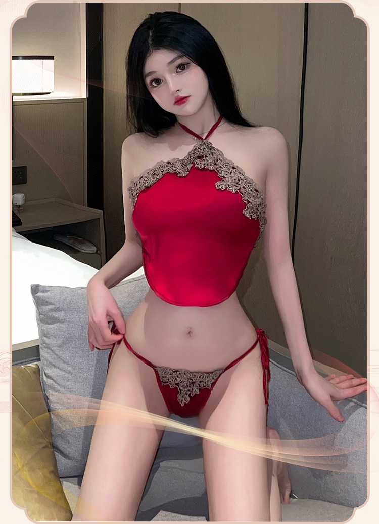 Sản phẩm là sự pha trộn hoàn hảo giữa vẻ đẹp cổ điển Trung Hoa với đường nét thiết kế hiện đại. Áo yếm cổ buộc dây tạo hình trái tim, viền ren hoa tinh tế mang lại cảm giác nhẹ nhàng, nữ tính nhưng cực kỳ quyến rũ.