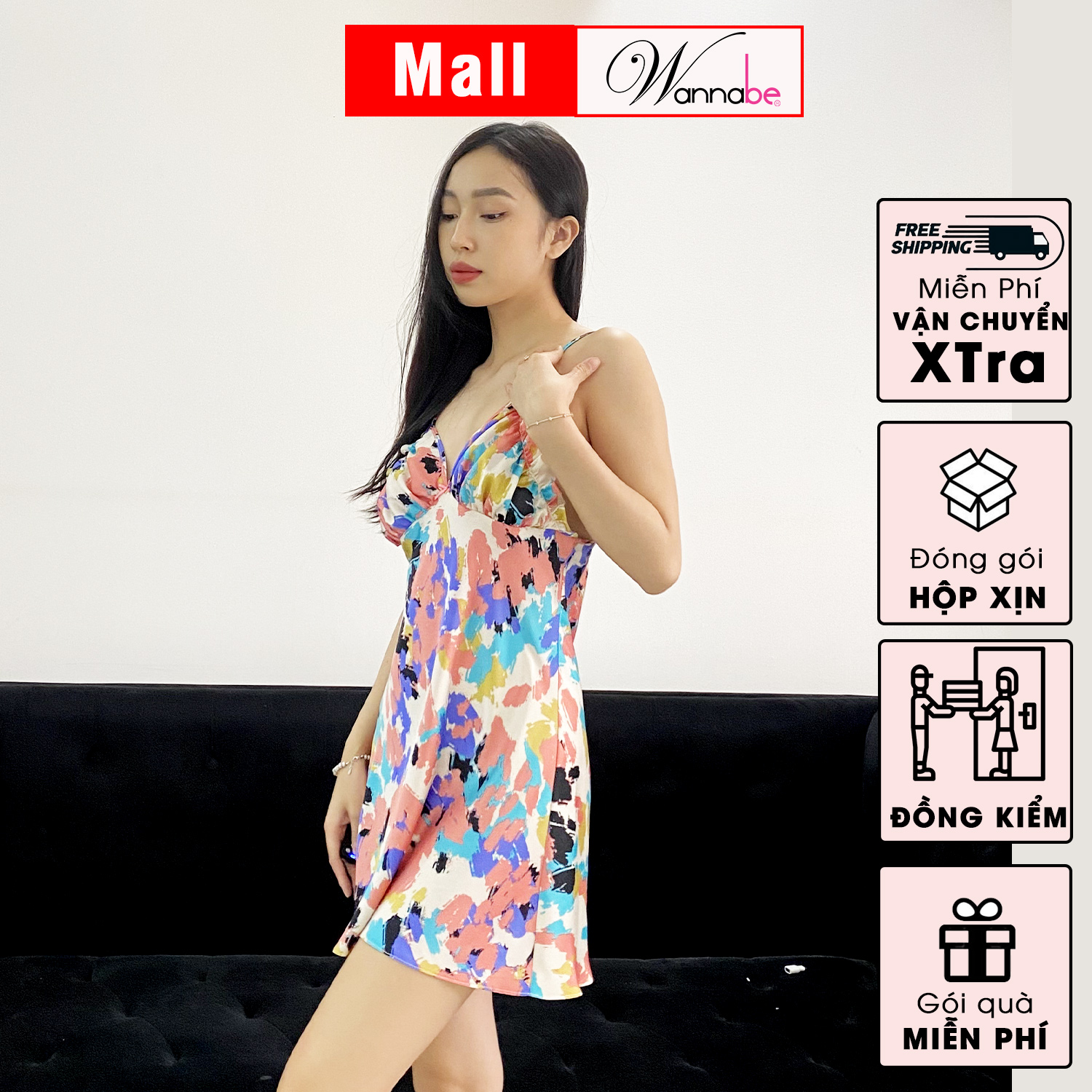 Chất liệu: đầm ngủ Wannabe thiết kế trên nền lụa tơ pháp họa tiết màu loang mềm mại nhẹ nhàng thoáng mát không nhăn không nóng mang đến cảm giác thoải mái dễ chịu cho người mặc trong mùa hè oi bức này