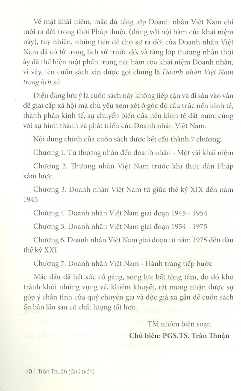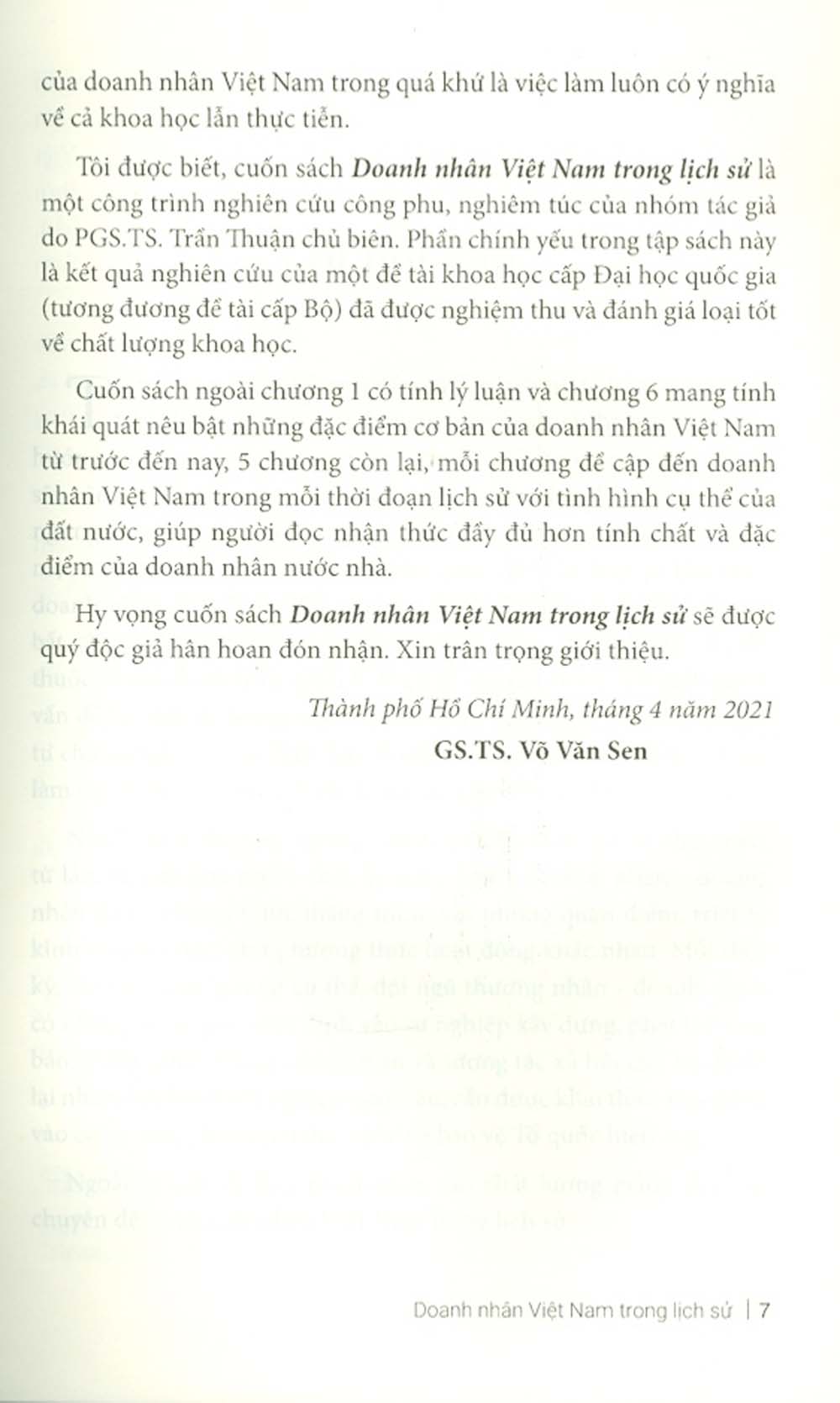 Doanh nhân Việt Nam trong lịch sử là một công trình nghiên cứu công phu, nghiêm túc của nhóm tác giả do PGS - TS Trần Thuận chủ biên. Cuốn sách ngoài chương 1 có tính lý luận và chương 6 mang tính khái quát, nêu bật những đặc điểm cơ bản của doanh nhân Việt Nam từ trước đến nay, 5 chương còn lại, mỗi chương đề cập đến doanh nhân Việt Nam trong mỗi thời đoạn lịch sử với tình hình cụ thể của đất nước, giúp người đọc nhận thức đầy đủ hơn tính chất và đặc điểm của doanh nhân nước nhà.