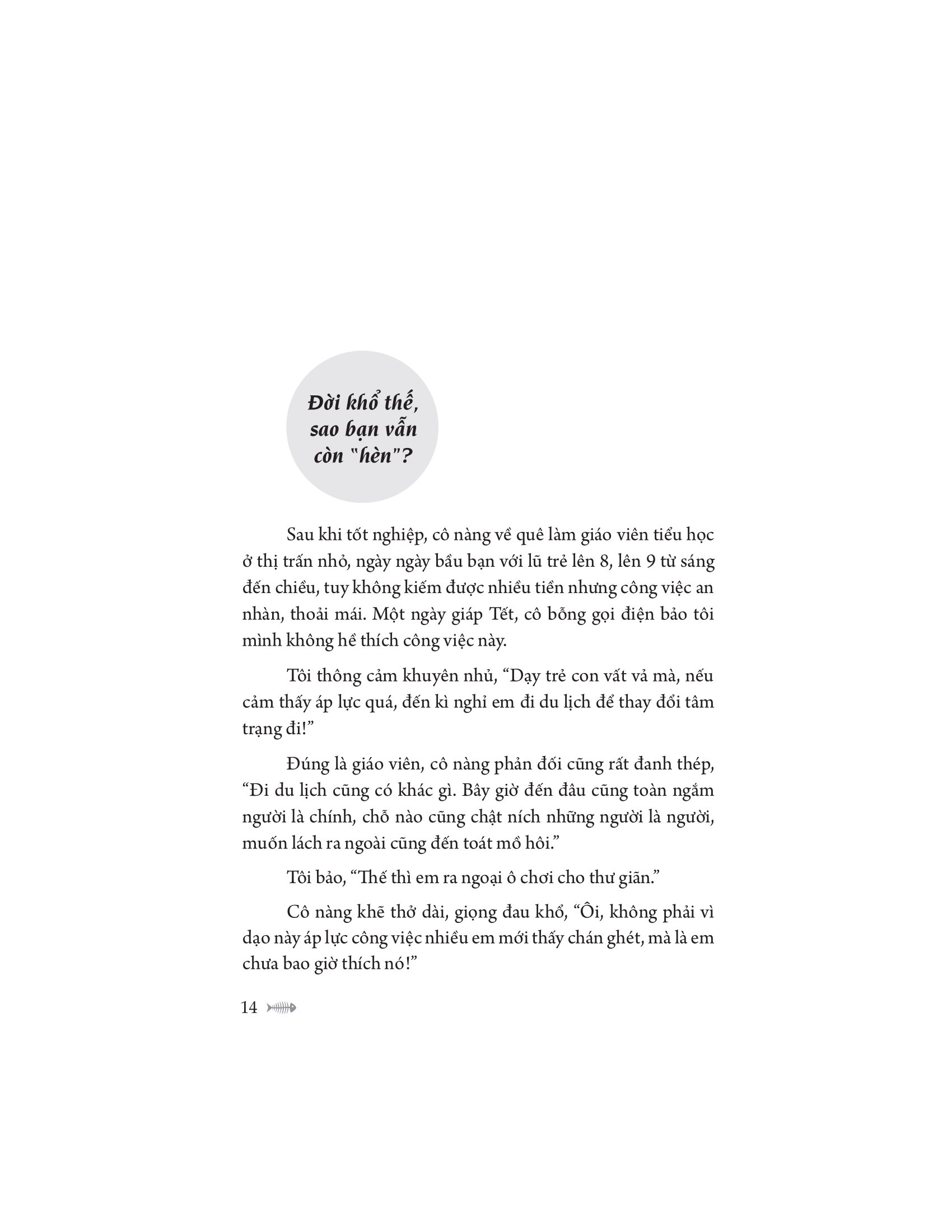 "Thế giới tươi đẹp như thế, có lí do gì mà chúng ta không cười nhiều lên một chút? Tôi không phải là người theo thuyết hữu thần, cũng không theo bất kì tôn giáo nào, nhưng tôi hi vọng những người có duyên tương ngộ với cuốn sách này như bạn, tuy gặp bao gập ghềnh trắc trở trong đời vẫn có thể lạc quan, kiên cường tiến lên phía trước. Tôi cũng mong rằng những trang viết của mình có thể mang lại chút an ủi, động viên bạn, để bạn có thể nương tựa vào đó mỗi khi thân tâm mệt nhoài."