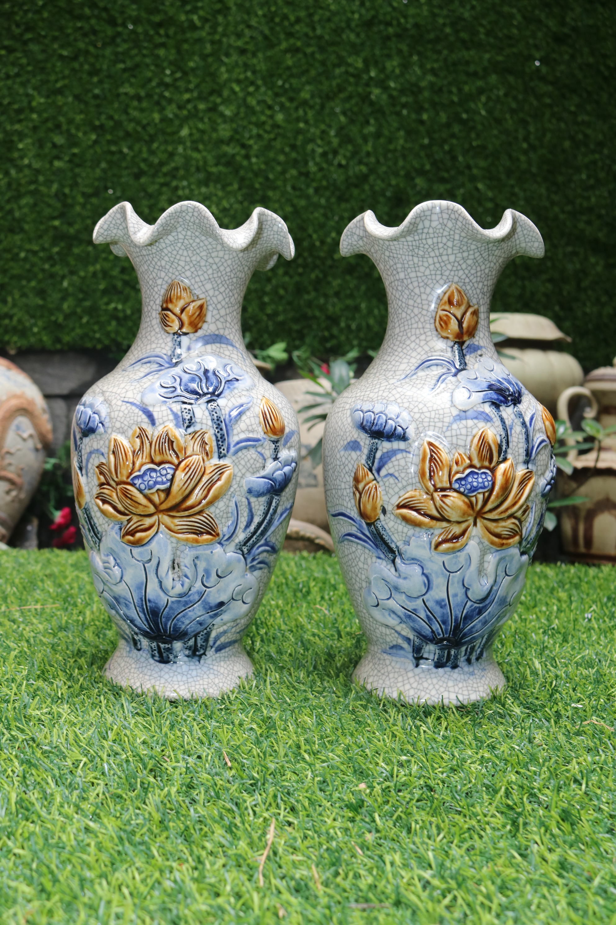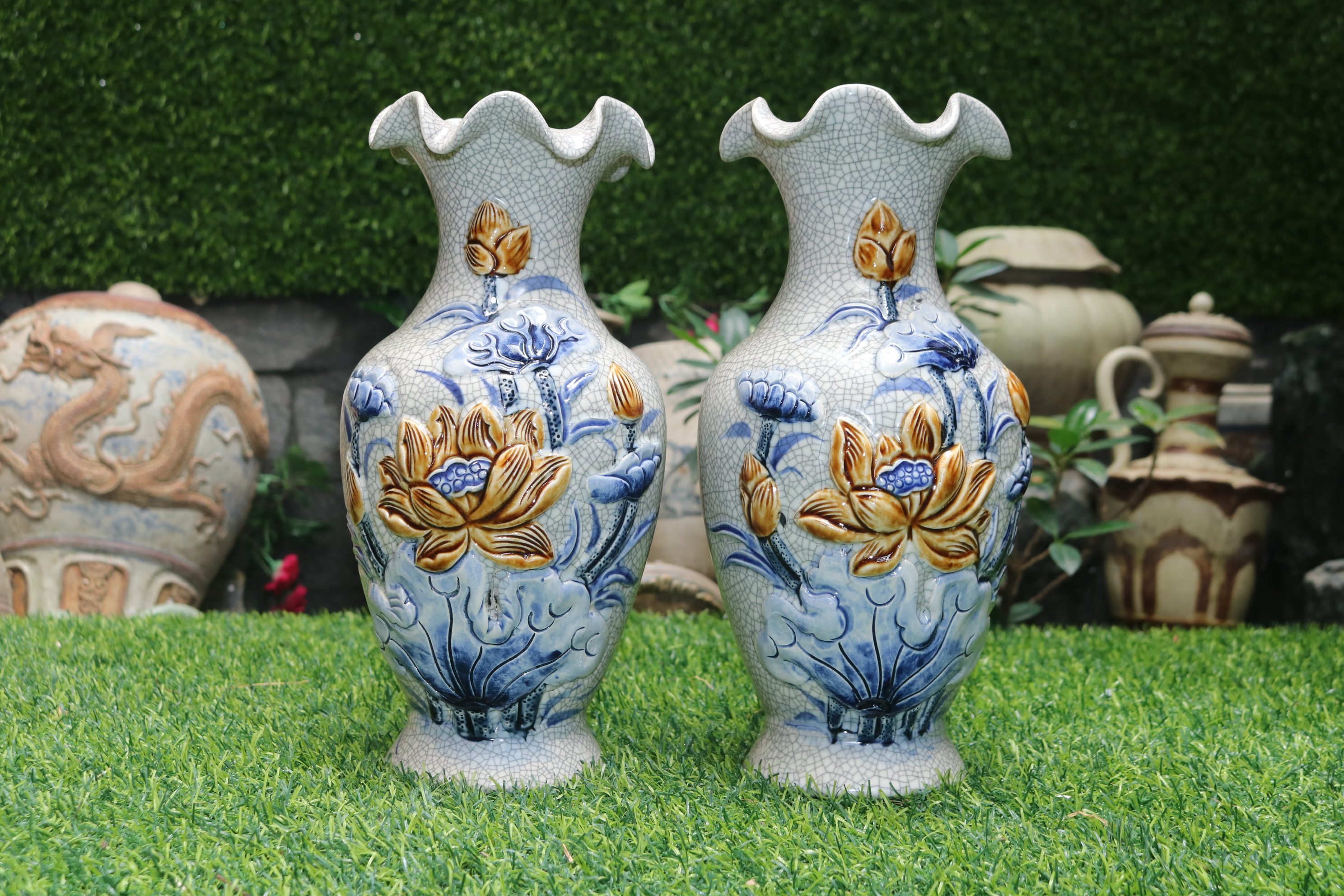 ✨Đôi lọ hoa men rạn đắp nổi sen dáng miệng lượn