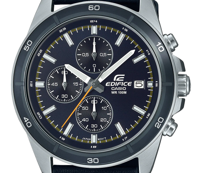 Đồng hồ bấm giờ EDIFICE cổ điển cỡ trung có sự kết hợp táo bạo giữa các chi tiết và thiết kế tinh xảo là sản phẩm sinh ra để dành cho bạn. Dây đeo bằng da thật kết hợp với mặt số màu xám đậm, lấy cảm hứng từ phong cách lái xe thành thị sành điệu.