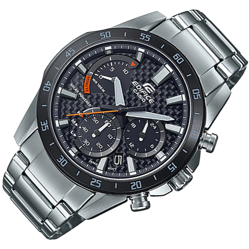 Đồng hồ ghi thời gian chạy bằng năng lượng mặt trời mới này có mặt số sợi carbon tượng trưng cho chủ đề đua xe thể thao của dòng sản phẩm EDIFICE. Màu sắc dễ nhìn của kim giây là kết quả của phản hồi từ các kỹ sư đua xe.