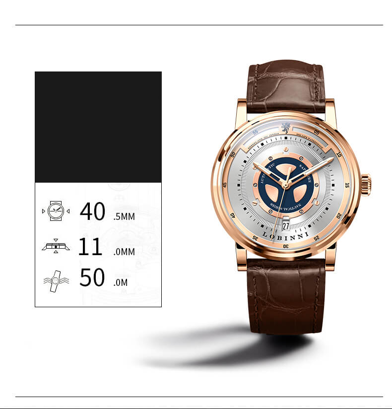 Nhãn hiệu LOBINNI Mã sản phẩm No.9010-1 Giới tính Nam Kiểu máy Automatic (Máy Cơ) Đường kính mặt 42 mm Độ dày 11 mm Chất liệu vỏ Thép không gỉ 316L Chất liệu dây Dây da cao cấp Chất liệu mặt kính Sapphire Khả