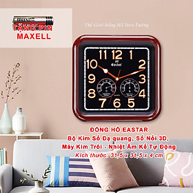 ✨Đồng Hồ Treo Tường Cao Cấp KIM TRÔI EASTAR SỐ NỔI 3D có DẠ QUANG và NHIỆT ẨM KẾ CƠ (Không Dùng Pin) - Hình Vuông Mặt Đen - Tặng Pin AA - Bảo Hành 1 Năm