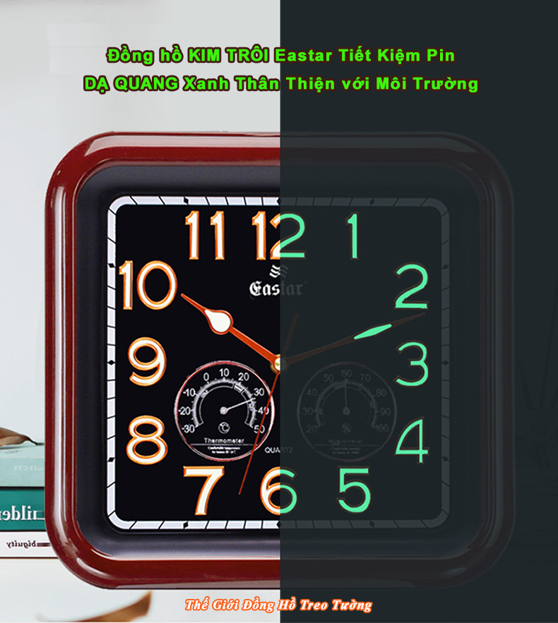 1. ĐẶC ĐIỂM NỔI BẬT: - Đồng hồ Treo tường Cao Cấp EASTAR Kim Trôi Nhật có Dạ quang (*), mặt vuông vát góc, kích thước 34,5 x 34, dày 5 cm. - Kiểu