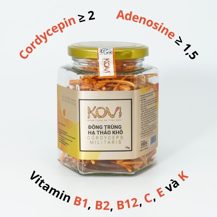 Đông trùng hạ thảo khô KOVI 50g là sản phẩm sấy thăng hoa giúp giữ nguyên vẹn các dưỡng chất quý giá như Cordycepin, Adenosine, Axit amin, Vitamin B1, B2, B12, C, E,... , mang lại nhiều lợi ích cho sức khỏe.