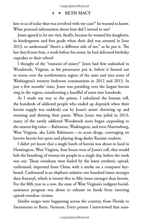 Beginning with a single dealer who lands in a small Virginia town and sets about turning high school football stars into heroin overdose statistics, Macy sets out to answer a grieving mother's question-why her only son died-and comes away with a gripping, unputdownable story of greed and need. From the introduction of OxyContin in 1996, Macy investigates the powerful forces that led America's doctors and patients to embrace a medical culture where overtreatment with painkillers became the norm. In some of the same communities featured in her bestselling book Factory Man, the unemployed use painkillers both to numb the pain of joblessness and pay their bills, while privileged teens trade pills in cul-de-sacs, and even high school standouts fall prey to prostitution, jail, and death.