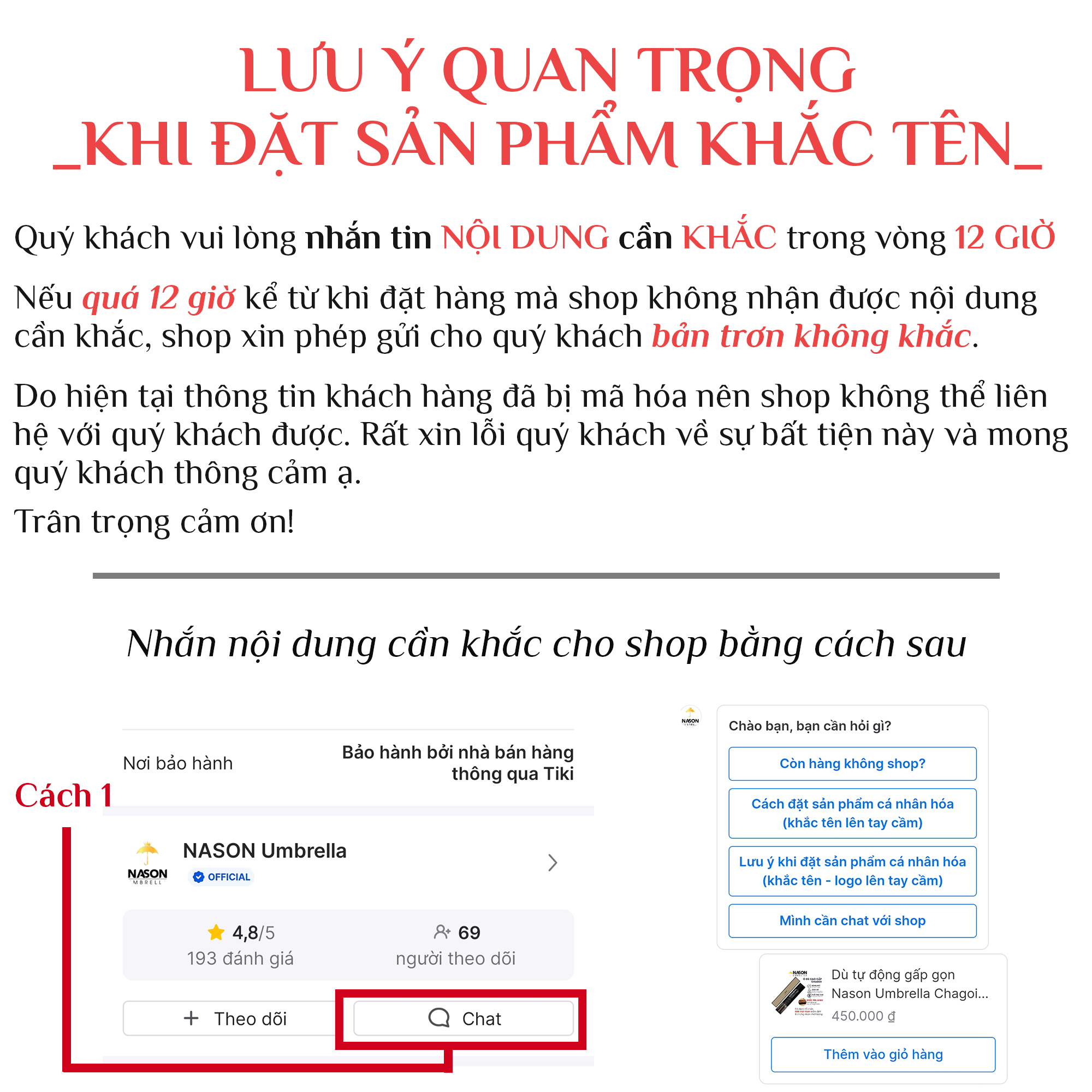 Mua tại TiktokNgày nay, nhu cầu dùng ô dù làm quà tặng đối tác, quà tặng khách hàng, quà tặng khuyến mại, quà tặng nhân viên,ày càng cao. Doanh nghiệp, công ty thường xuyên đặt hàng với số lượng lớn từ vài trăm đến vài nghìn chiếc ô thẳng cao cấp tự động một chiều Nason tay cầm gỗ mỗi lần làm quà tặng cho doanh nghiệp. Vậy vì sao nó Nason Gentle lại có sức hút như vậy. Lưu ý dịch vụ khắc tên - logo Tay cầm chắc chắn, sang trọng Tay cầm được làm hoàn toàn từ gỗ khắc logo chìm nên mang lại sự thanh lịch và hiện đại. Tay cầm còn phủ một lớp nhám giúp cho việc cầm ô dễ dàng, không dễ dàng bị tuột khi cầm nắm. Thông tin chi tiết
