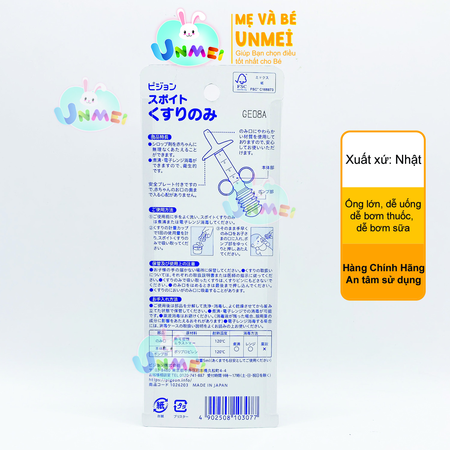 – Dụng cụ uống thuốc Pigeon được sản xuất từ chất liệu nhựa PP cao cấp, không sử dụng BPA nên rất an toàn cho sức khỏe của bé.