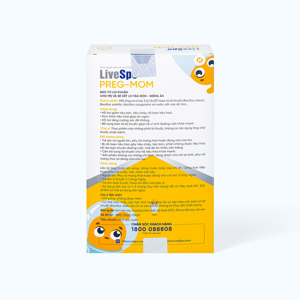 - Để xa tầm tay trẻ em. Thông tin sản xuất của Bào tử lợi khuẩn cho mẹ và bé LiveSpo Pregmom Công ty chịu trách nhiệm về SP: Công ty TNHH LiveSpo Pharma Công ty phân phối: Công ty TNHH LiveSpo Pharma