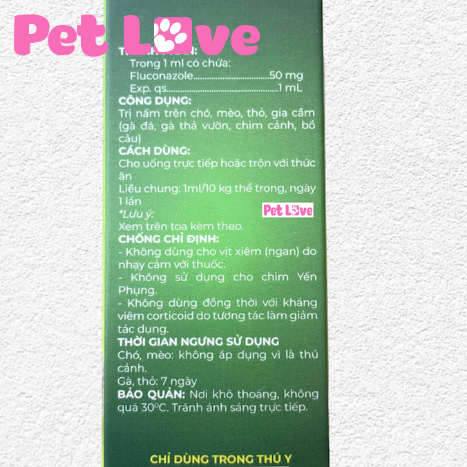 - Diệt nấm trên chó, mèo, thỏ, gia cầm (gà đá, gà thả vườn, chim cảnh, bồ câu). - Cho uống trực tiếp hoặc trộn với thức ăn, rất an toàn và tiện lợi. - Sản phẩm của công ty Vemedim. CÁCH DÙNG: Cho uống trực tiếp hoặc trộn với thức ăn. Liều dùng: 1ml/10 kg thể trọng, ngày 1 lần. CHỐNG CHỈ ĐỊNH: Không dùng cho vịt xiêm (ngan), chim Yến Phụng. Không dùng đồng thời với kháng viêm corticoid do tương tác làm giảm tác dụng. Bộ sản phẩm bao gồm: 1 chai (30ml)