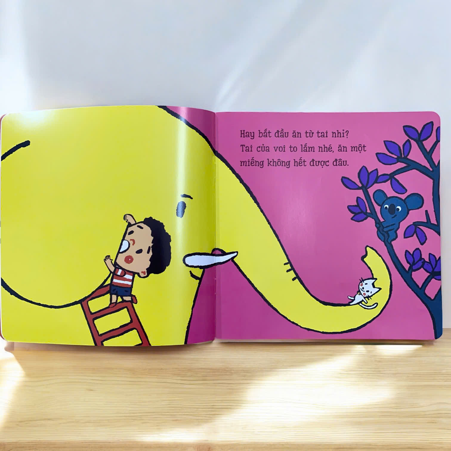 “Ôi, các bạn nhỏ ơi! Tớ đói quá, tớ có thể ăn cả một con voi đấy! Nhưng bắt đầu từ đâu nhỉ? Ăn cái vòi, cái tai, cái đầu, hay cái đuôi đây? Ai muốn cùng tớ thử không?” Cuốn sách dẫn dắt bé qua hành trình tưởng tượng hài hước và thú vị, mỗi trang là một bất ngờ cho các bạn nhỏ.