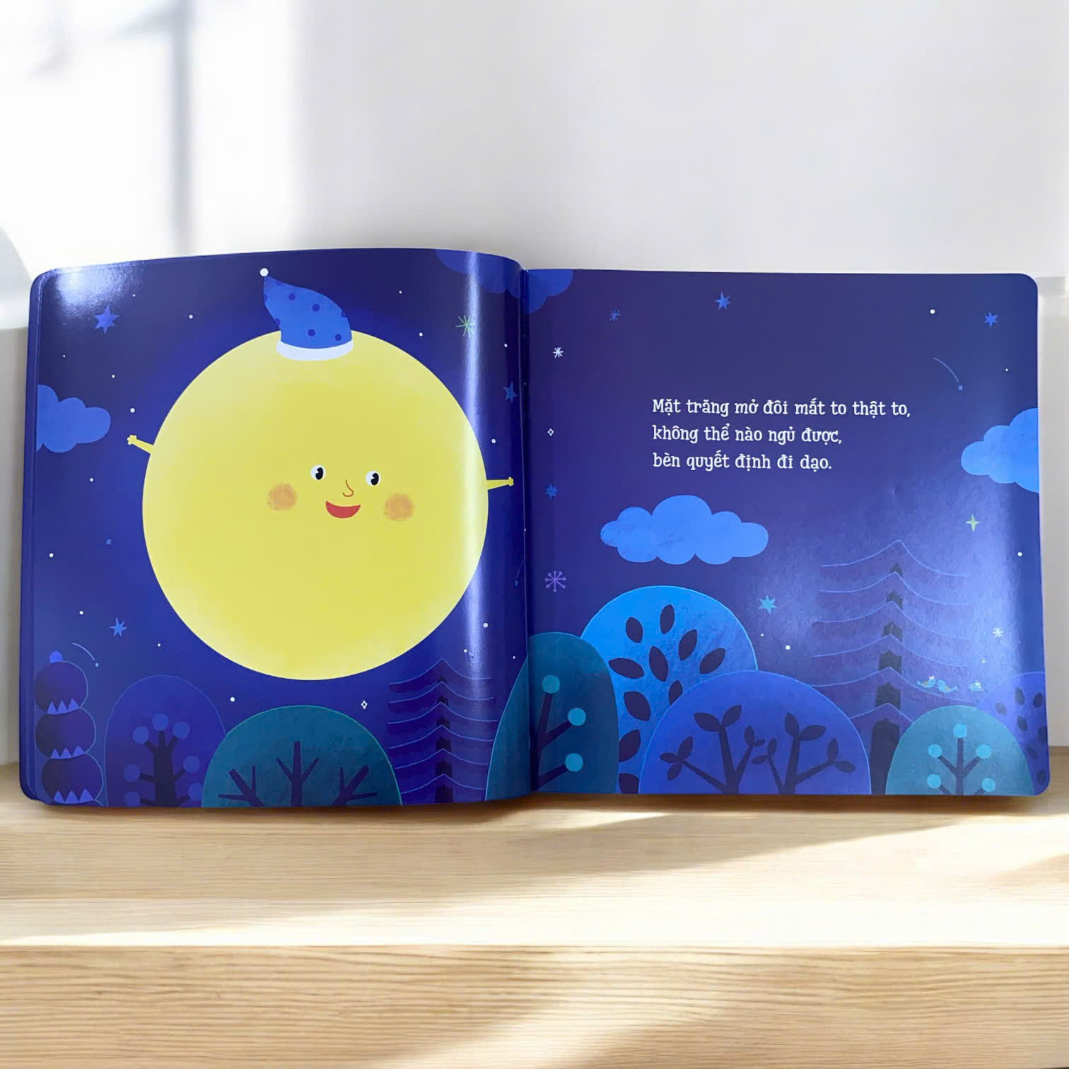 Khi màn đêm buông xuống, mặt trăng cũng thao thức và bắt đầu chuyến đi dạo khắp khu rừng để gửi những lời chúc ngủ ngon thật êm ái. Qua từng trang sách, bé sẽ thấy mặt trăng nhẹ nhàng ghé thăm và chúc từng bạn động vật ngủ thật ngon – từ bạn nhện, bạn nhím, bạn thiên nga đến bạn cừu, tất cả đều đã say giấc nồng. Đến lượt mình, mặt trăng cũng được bạn cú mèo khẽ chúc ngủ ngon, khép lại một đêm yên bình.