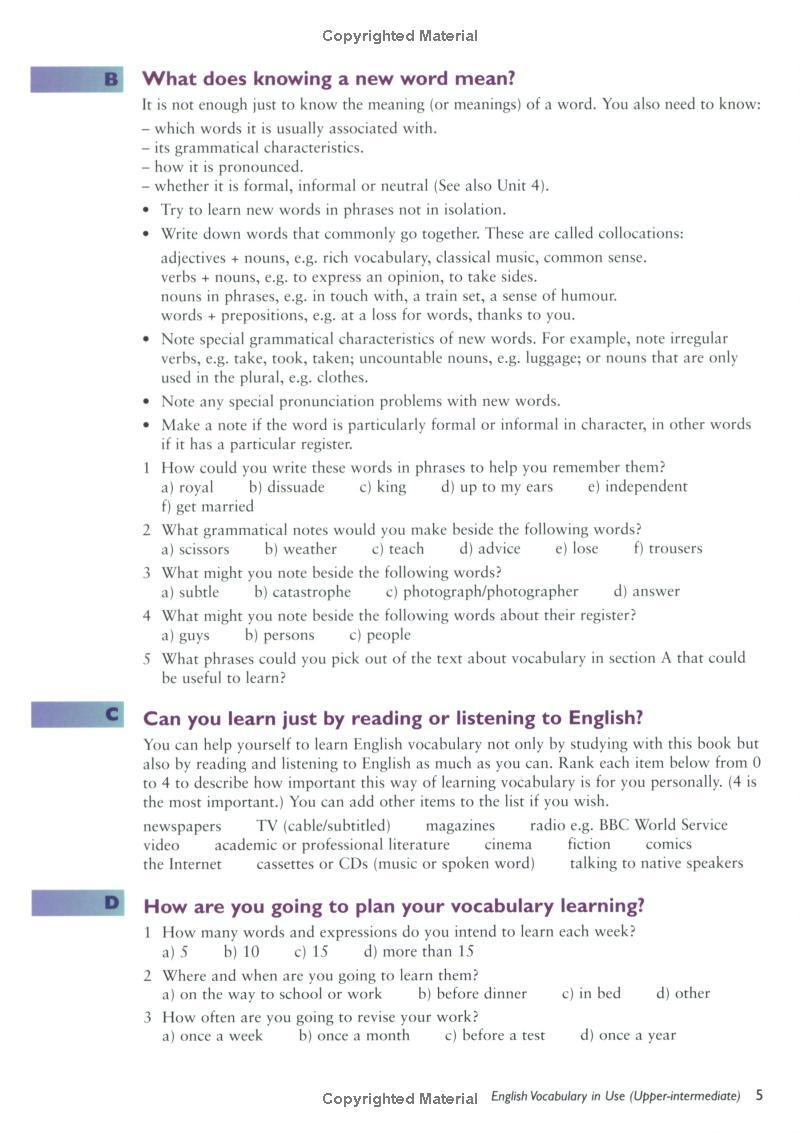 The words you need to communicate with confidence. Vocabulary explanations and practice for upper-intermediate level (B2) learners of English. Perfect for both self-study and classroom activities. Quickly expand your vocabulary with over 100 units of easy to understand explanations and practice exercises. Be confident about what you are learning, thanks to Cambridge research into how English is really spoken and written, and get better at studying by yourself, with units on learning vocabulary, personalised practice and an easy to use answer key.