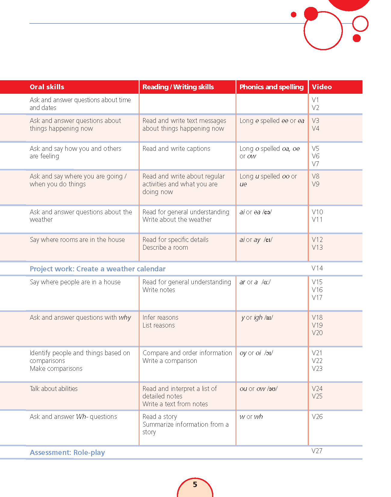 Sách: Learning English 5 - Dành Cho Học Sinh Lớp 5 NỘI DUNG VÀ CẤU TRÚC CỦA QUYỂN SÁCH : Bảng mục lục: Chỉ rõ các mục tiêu chính và trọng tâm của mỗi bài