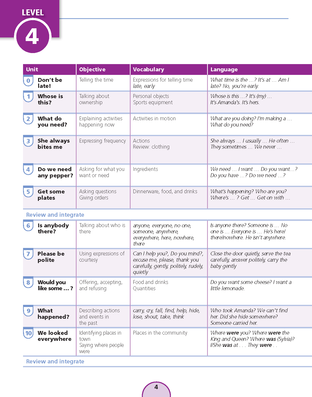 Sách: Learning English 4 - Dành Cho Học Sinh Lớp 4 NỘI DUNG VÀ CẤU TRÚC CỦA QUYỂN SÁCH : Bảng mục lục: Chỉ rõ các mục tiêu chính và trọng tâm của mỗi bài