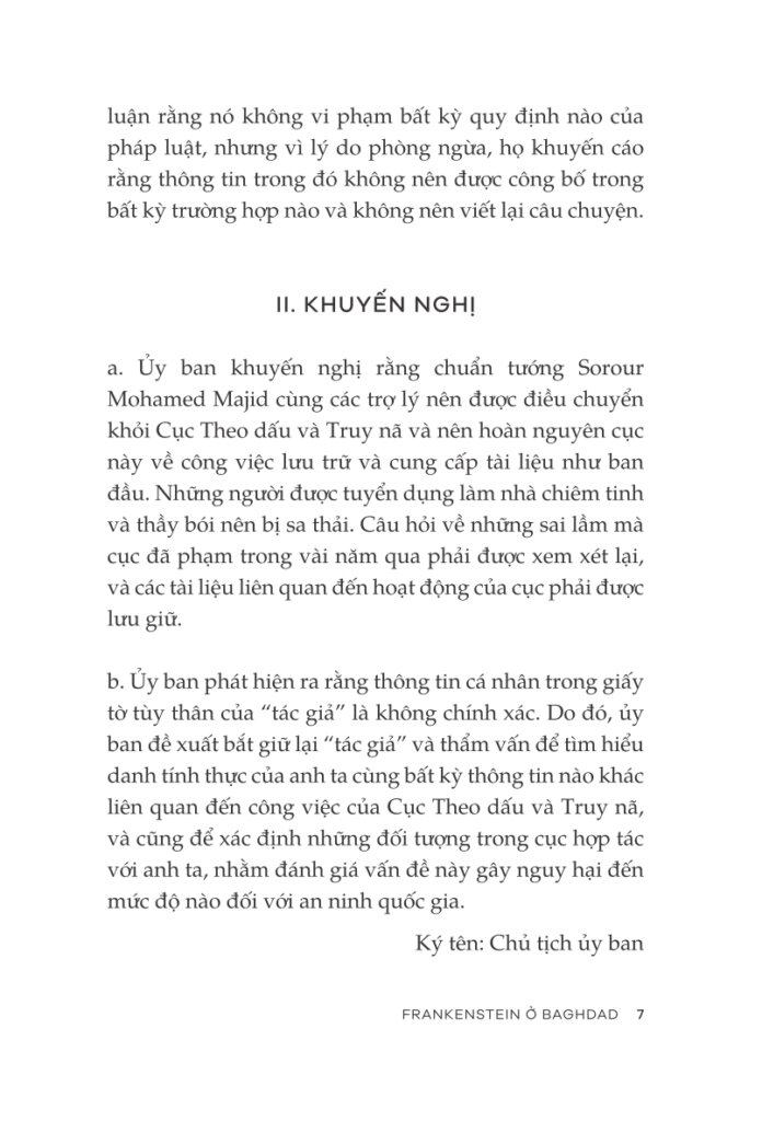 Cho đến nay, những gì ta biết về Iraq và cuộc chiến Iraq chủ yếu là từ nguồn phương Tây, lọc qua cách nhìn và nghĩ của phương Tây. Cuốn sách này cho ta cơ hội hiếm hoi để đắm mình vào đất nước và cuộc chiến đó thông qua trái tim và khối óc của một nhà văn tài hoa là con của xứ sở đó và đang sống ở thủ đô Baghdad, nơi mà hiện nay, nhiều năm sau chiến tranh, bom tiếp tục nổ, người tiếp tục chết vì bom, và có người, như Ahmed Saadawi, tiếp tục viết văn, mổ xẻ cái số phận chẳng giống ai của đất nước mình. Baghdad, nơi văn chương tồn tại để khôi phục sự hữu lý sát cạnh cái chết vô lý nhất, và nơi có những người như Ahmed Saadawi, viết văn để sự tồn tại của bản thân mình có một ý nghĩa: một hành trình phản kháng sự vô nghĩa.