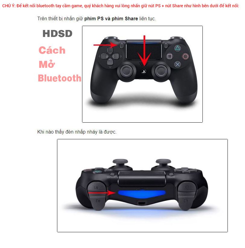 - CHÚ Ý: Để kết nối bluetooth tay cầm game, quý khách hàng vui lòng nhấn giữ nút PS (ở giữa) + nút Share (góc bên trái) như hình hướng dẫn bên dưới