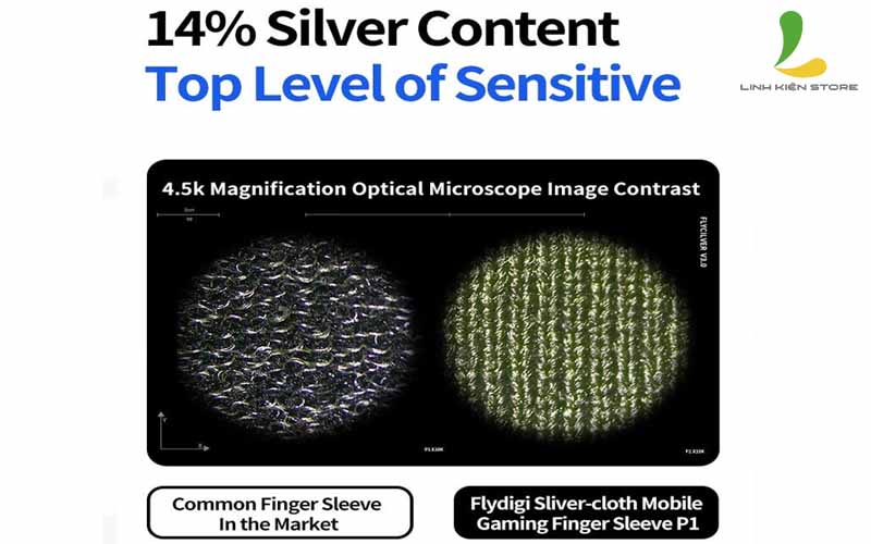 - Thao tác nhanh và mượt mà Đa phần găng tay chơi game trên thị trường chứa hàm lượng bạc rất ít (chỉ chiếm 4%). Điều này khiến kết cấu của chúng rời rạc và dễ hư hỏng form dáng. Ngược lại, Flydigi Sleeve P1 chiếm đến 14% hàm lượng bạc nên rất bền bĩ. Tăng tính chính xác và linh hoạt hơn khi bạn bấm vào những icon nhỏ trên màn hình. Hình ảnh dưới kính hiển vi quang học