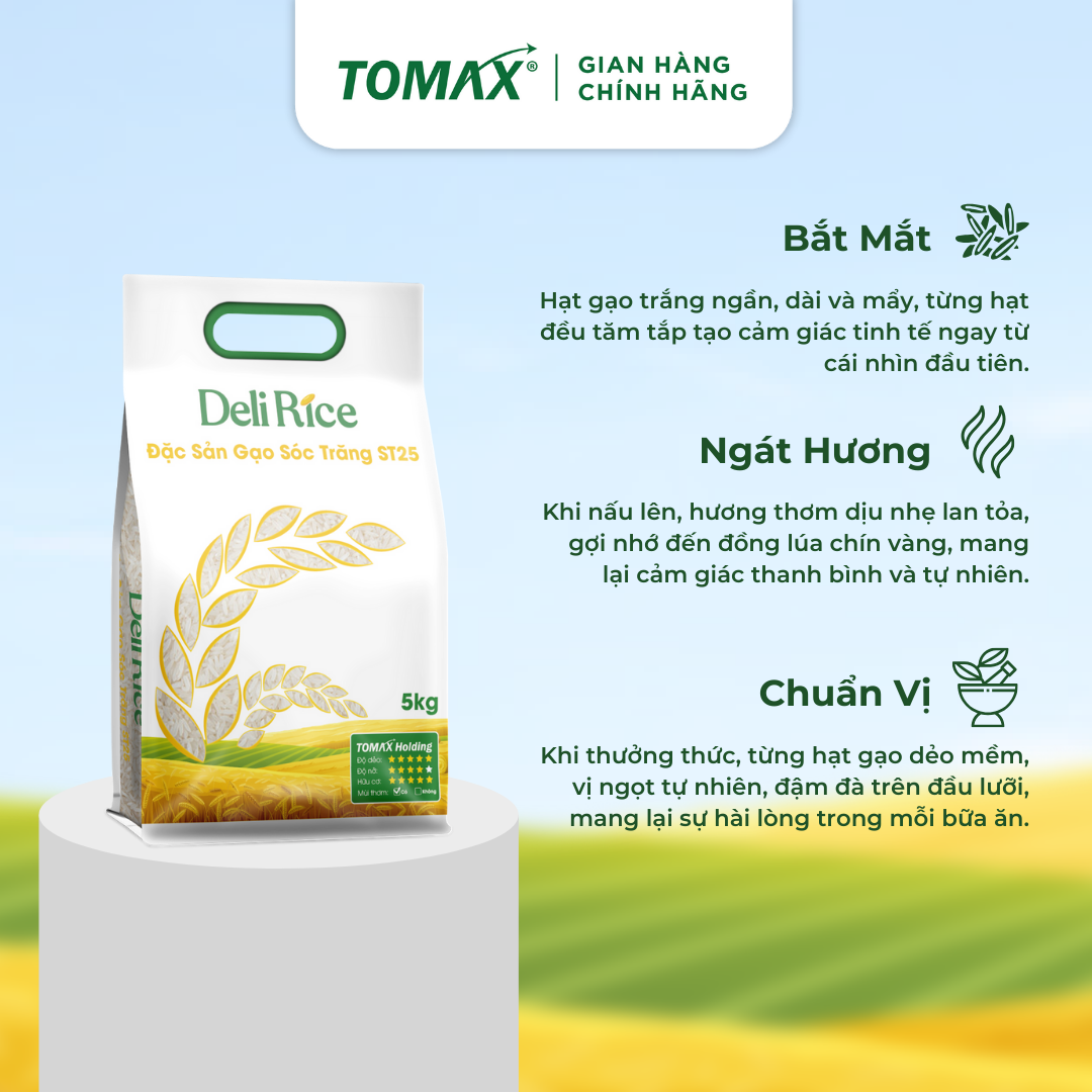 Giá trị ưu việt của Gạo sạch đặc sản Sóc Trăng ST25 Deli Rice Được canh tác theo hướng hữu cơ với quy trình khép kín đạt chuẩn, gạo sạch ST25 của Tomax Holding sở hữu những ưu điểm vượt trội: