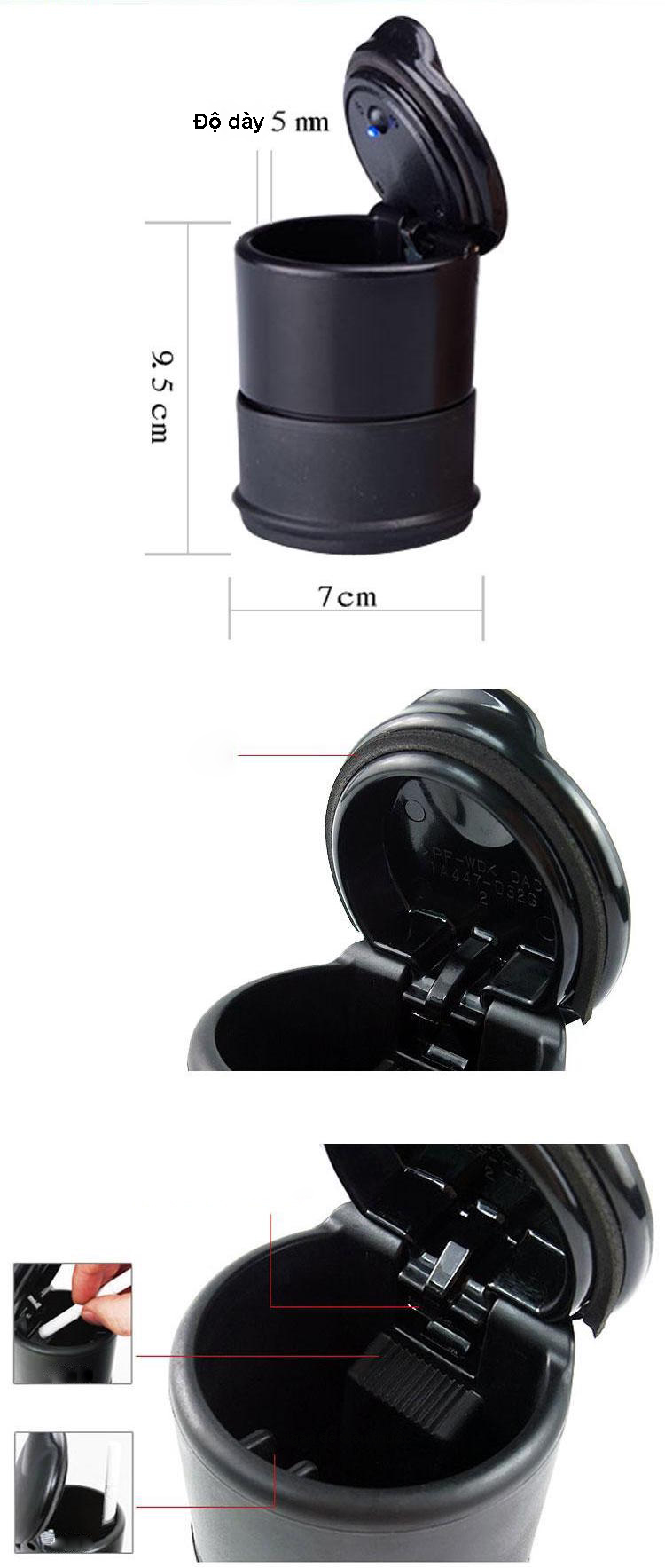 - Sản phẩm gạt tàn xe hơi cao cấpnổi bật với chất liệu nhựa ABS có sức chịu nhiệt độ cao, đèn led phát sáng. Với thiết kế vừa khít phần lớn khay giữ cốc trên mọi ô tô. Đèn led thông minh tự kích hoạt, phát sáng mày xanh khi mở nắp, an toàn sử dụng ngay cả trong đêm tối.