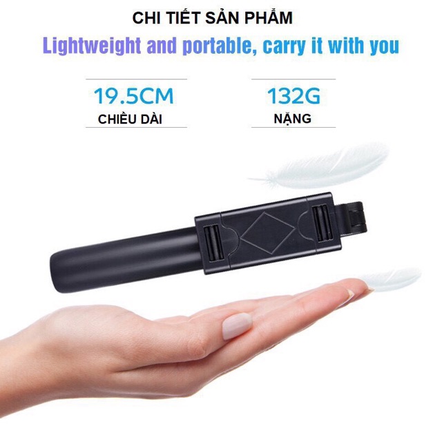 Gậy chụp ảnh quay video 3 chân có đèn led trợ sáng Gậy tự sướng selfie chụp hình bluetooth điều khiển từ xa xoay nhiều góc độ loại tốt Đặc điểm nổi bật: - Chụp ảnh bluetooth đến 10 mét - Gậy chụp ảnh 3 chân tripod tiện lợi - Xoay điện thoại ngang dọc linh hoạt - Gấp gọn, co dãn điều chỉnh điện thoại thông minh - Phù hợp nhiều loại điện thoại hiện nay Lưu ý : Bên shop có 2 phân loại gồm : Gậy có đèn và Gậy không đèn ( Qúy khách đặt hàng chú ý chọn đúng phân loại cần mua ạ ) Chi tiết sản phẩm: 1. Loại có đèn led trợ sáng (bản nâng cấp): - Có điều khiển blueetooth, có xoay được điện thoại ngang, dọc, gập lên gập xuống - Có đèn led trợ sáng sạc điện (đã kèm sạc USB) - Với ưu điểm có đèn sẽ giúp bạn tăng sáng cho bức ảnh hoặc video bạn quay có độ sáng hơn và đẹp hơn hẳn - Màu sắc: Đen - Chất liệu: nhựa ABS+ inox - Pin: Cr1632 - Kích thước: chiều dài tối đa đạt 100cm - Điều khiển: sử dụng remote Bluetooth điều khiển từ xa khoảng cách lên đến 10 mét 2. Loại thường (không có đèn trợ sáng): - Có điều khiển blueetooth, có xoay được điện thoại ngang, dọc, chốt vặn gập lên xuống - Màu sắc: Đen - Chất liệu: nhựa ABS+ inox - Pin: Cr1632 - Kích thước: chiều dài tối đa đạt 100cm - Điều khiển: sử dụng remote Bluetooth điều khiển từ xa khoảng cách lên đến 10 mét 4. Gậy chụp ảnh XT-02 - Mã : XT02 - Có điều khiển blueetooth, có xoay được điện thoại ngang, dọc, gập lên gập xuống - Chất liệu: nhựa ABS+ inox - Màu sắc: Đen - Pin: Cr1632 - Kích thước: chiều dài tối đa đạt 80cm