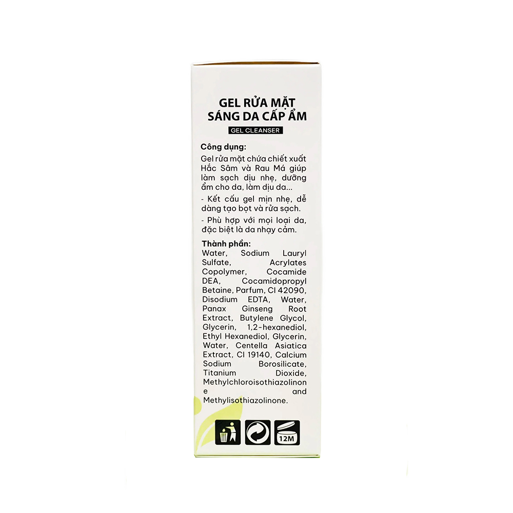 Mua tại TiktokCông dụng: Gel rửa mặt chứa chiết xuất Hắc Sâm và Rau Má giúp làm sạch dịu nhẹ, dưỡng ẩm cho da, làm dịu da... Kết cấu gel mịn nhẹ, dễ dàng tạo bọt và rửa sạch. Phù hợp với mọi loại da, đặc biệt là da nhạy cảm. Thành phần: Water, Sodium Lauryl Sulfate, Acrylates Copolymer, Cocamide DEA, Cocamidopropyl Betaine, Parfum, CI 42090, Disodium EDTA, Water, Panax Ginseng Root Extract, Butylene Glycol, Glycerin, 1,2-hexanediol, Ethyl Hexanediol, Glycerin, Water, Centella Asiatica Extract, CI 19140, Calcium Sodium Borosilicate, Titanium Dioxide, Methylchloroisothiazolinone and Methylisothiazolinone. Hướng dẫn sử dụng: Lấy một lượng vừa đủ, tạo bọt với nước, thoa đều và massage nhẹ nhàng. Rửa sạch lại với nước. Điều kiện bảo quản: