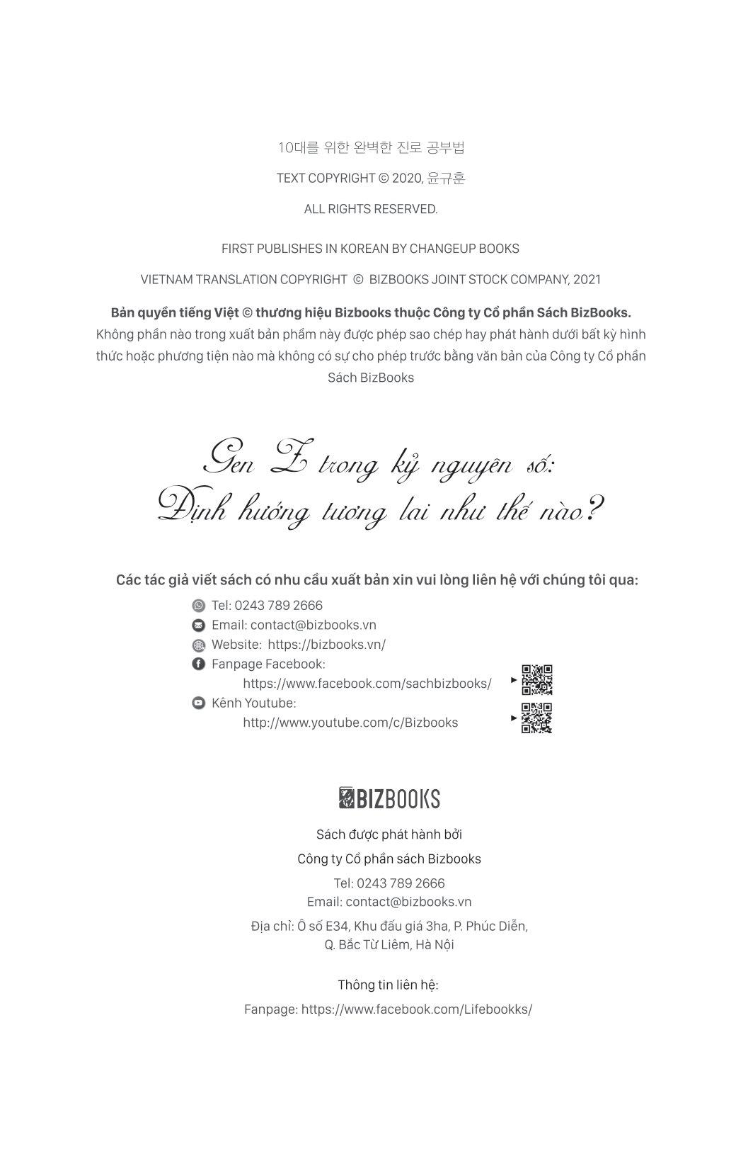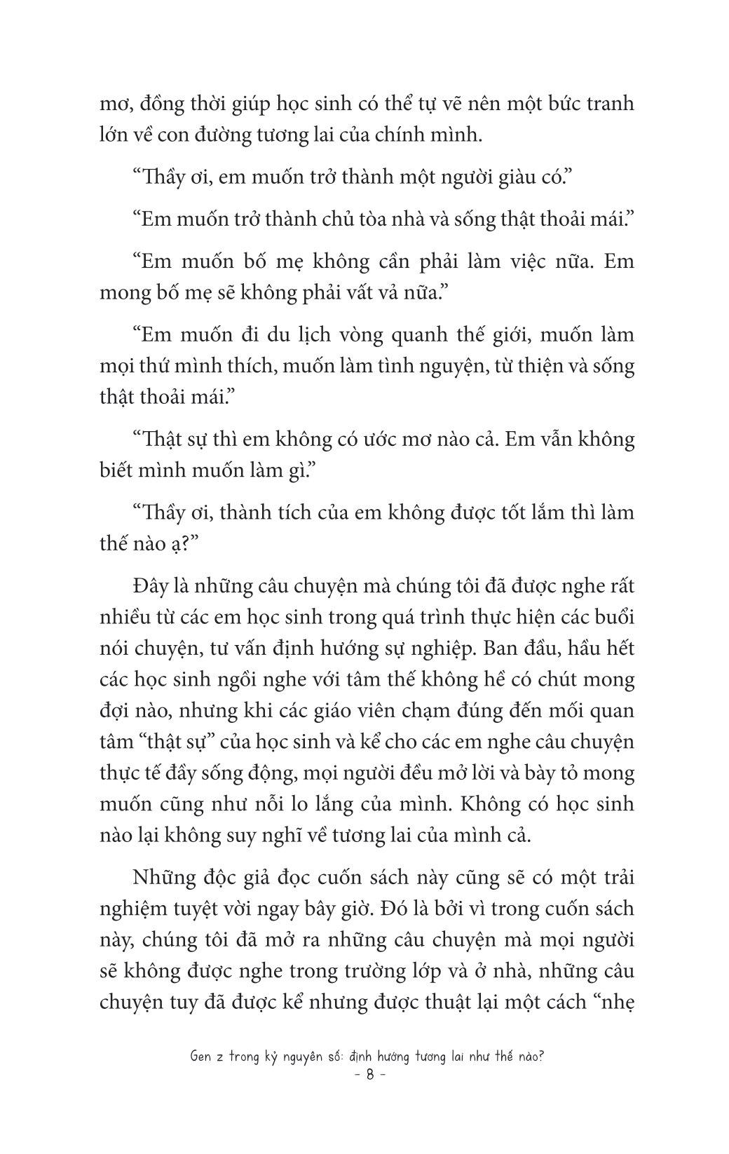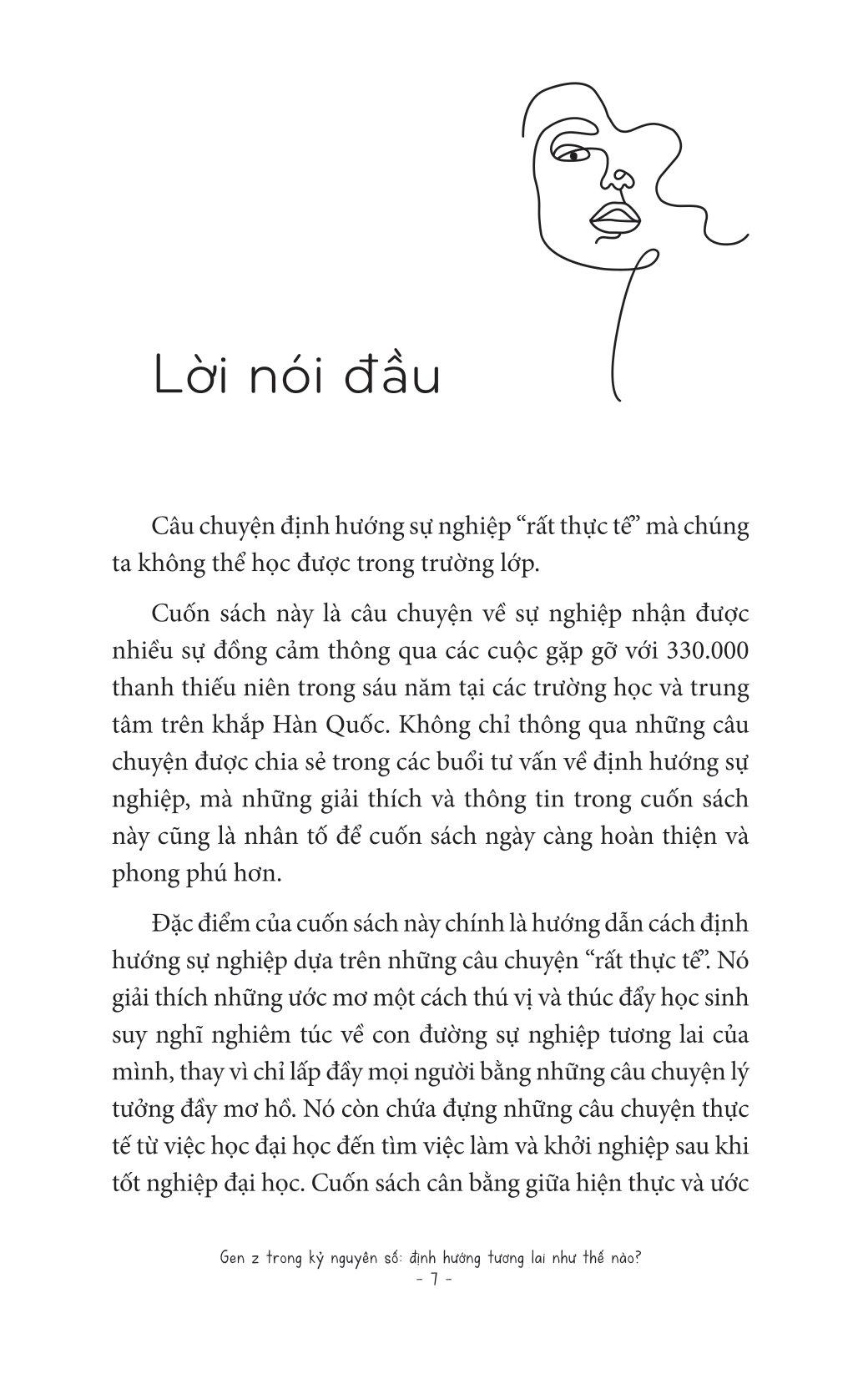Genz Trong Kỷ Nguyên Số - Định Hướng Tương Lai Như Thế Nào? Bởi vì khi ai đó đang chơi, tôi đang đọc cuốn sách này! Cuốn sách là câu chuyện thành công và thất bại thông qua các cuộc gặp gỡ với hơn 330.000 thanh thiếu niên trong 6 năm trời. Đặc điểm cuốn sách này chính là hướng dẫn cách định hướng sự nghiệp dựa trên các câu chuyện rất "thực tế". "Thầy ơi, em muốn trở thành một người giàu có" "Em muốn trở thành chủ tòa nhà và sống thoải mái" "Em muốn bố mẹ không phải vất vả làm việc nữ. Em mong bố mẹ sẽ không phải vất vả nữa" Đây là những câu chuyện mà chúng tôi được nghe rất nhiều từ các em học sinh trong quá trình thực hiện các buổi nói chuyện, tư vấn định hướng sự nghiệp. Không có học sinh nào lại không suy nghĩ về tương lai của m.ình cả. Khi bất chợt được hỏi về ước mơ tương lai, nhiều bạn trẻ gen Z sẽ dõng dạc trình bày những mong muốn, cũng như việc các bạn đang làm để đạt được ước mơ đó. Thế nhưng cũng có những bạn trẻ vẫn còn mơ hồ về 2 từ "ước mơ", họ thực sự không biết m.ình giỏi gì, muốn gì. Trong cuốn sách Gen Z trong kỷ nguyên số: Định hướng tương lai như thế nào?, tác giả Yun Kyu Hoon thông qua những cuộc nói chuyện với hơn 330.000 thanh thiếu niên tại các trường trung học sẽ chỉ cho bạn thấy cách làm thế nào để vạch ra một con đường sự nghiệp tương lai đúng đắn dù bạn đã có đam mê hay chưa tìm ra. Việc định hướng này rất quan trọng, đặc biệt trong tình hình cả thế giới đang đối mặt với đại dịch covid và sự thay đổi chóng mặt do nền công nghiệp 4.0 mang lại. Những tư duy nào nên có, những nghề nghiệp nào nên được ưu tiên, những kỹ năng nào cần đào sâất cả đều đang chờ bạn lật mở cuốn sách này để khám phá. Câu chuyện định hướng sự nghiệp rất thực tế mà chúng ta không được học ở trường lớp! Những độc giả đọc cuốn sách này cũng sẽ có một trải nghiệm tuyệt vời ngay bây giờ. Đó là bởi vì trong cuốn sách này, chúng tôi đã mở ra những câu chuyện mà mọi người không được nghe trong trường lớp và ở nhà. Độc giả sẽ biết được "bí quyết thành công" của những tiền bối có tuổi tác không chênh lệch là bao so với chũng ta, nhưng họ đã đạt được ước mơ, hay trở thành những người giàu có đang tận hưởng cuộc sống. Ngoài ra, người đọc cũng có thể học hỏi "bí quyết" được giấu kín của những người tuy học không giỏi trong trường nhưng lại thành công ngoài xã hội. Ngay cả khi bạn không có tiền, không học giỏi, không bằng cấp, không phải là người "ngậm thìa vàng", thì cuốn sách này có thể thay đổi cuộc đời và tương lai bạn. Bất cứ ai cũng có thể tận hưởng thành công và hạnh phúc mà họ mong muốn nếu họ tin tưởng và áp dụng chúng vào thực tế!