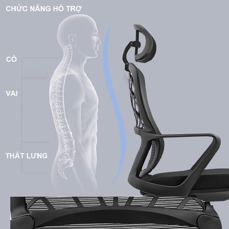 Đặc điểm nổi bật Thiết kế công thái học: hỗ trợ cột sống, giảm đau mỏi lưng – cổ khi ngồi lâu. Lưng lưới thoáng khí: ngồi thoải mái, không nóng lưng. Đệm mút bọc