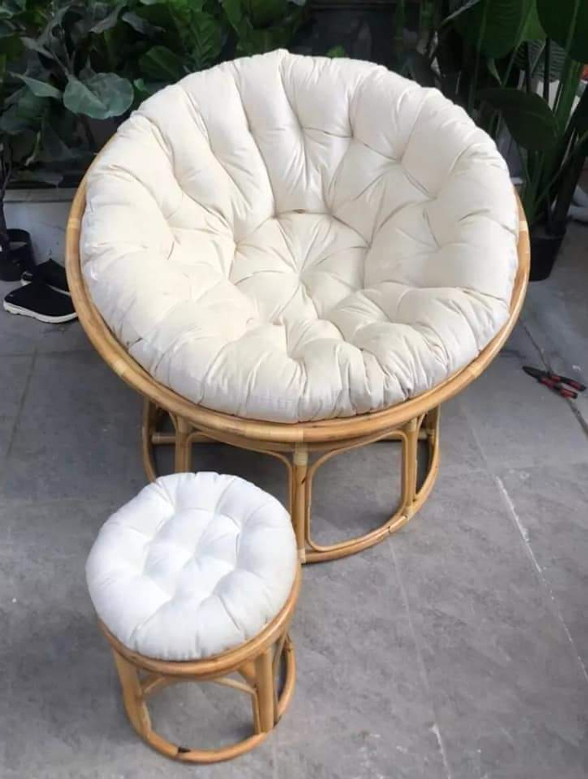 Bộ sản phẩm gồm : Ghế papasan size 1m kèm nệm vải bố màu kem cao cấp; Bàn tròn 60cm x 50cm; Đôn ghế 35cm x 40cm như hình mô tả Chất liệu ghế :
