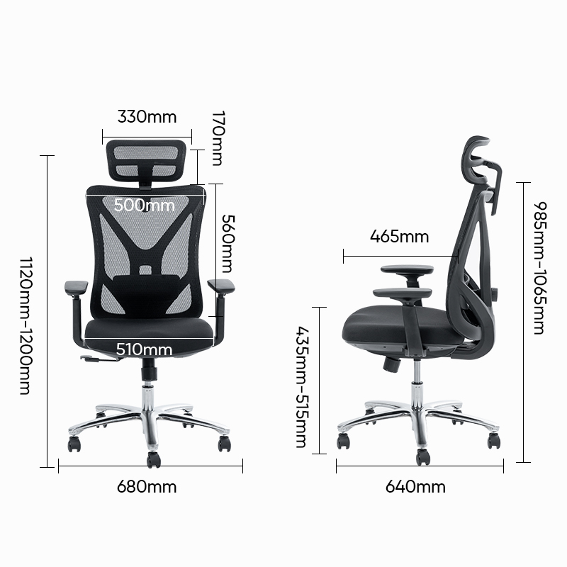 Kích thước: W49-58 x D47 x H92-104 cm (Cao tổng). H từ ngồi đến lưng: 48 cm, H Tay: 64-76 cm, H đất-ngồi: 48-60 cm (Lúc Ben thấp – Ben cao) Chất liệu: lưng rời,