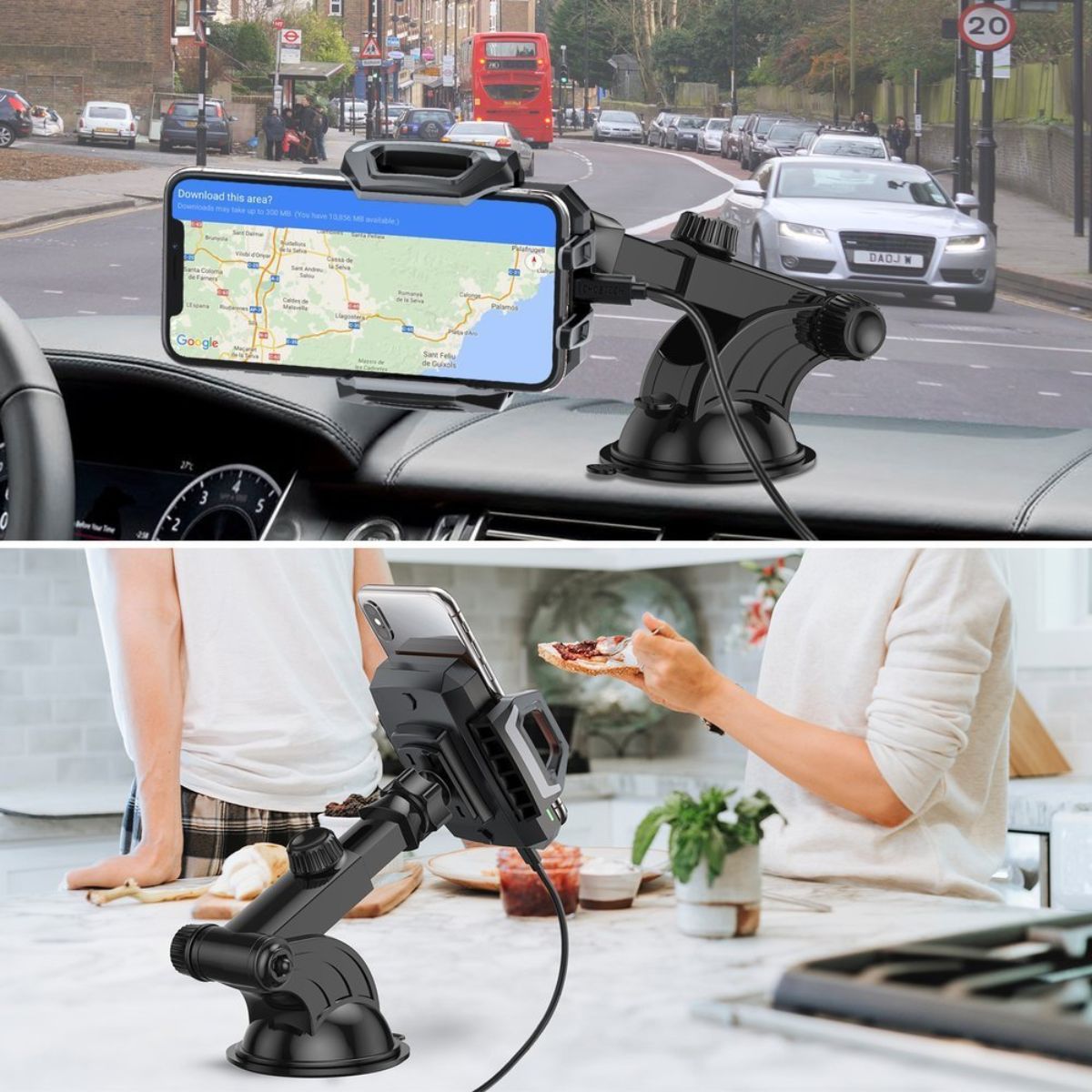 ĐẶC ĐIỂM NỔI BẬT + Đế hít bằng keo chắc chắn, có thể gắn vào kính chắn gió hoặc táp lô. + Thân kép có thể điều chỉnh độ dài + Phần kẹp điện