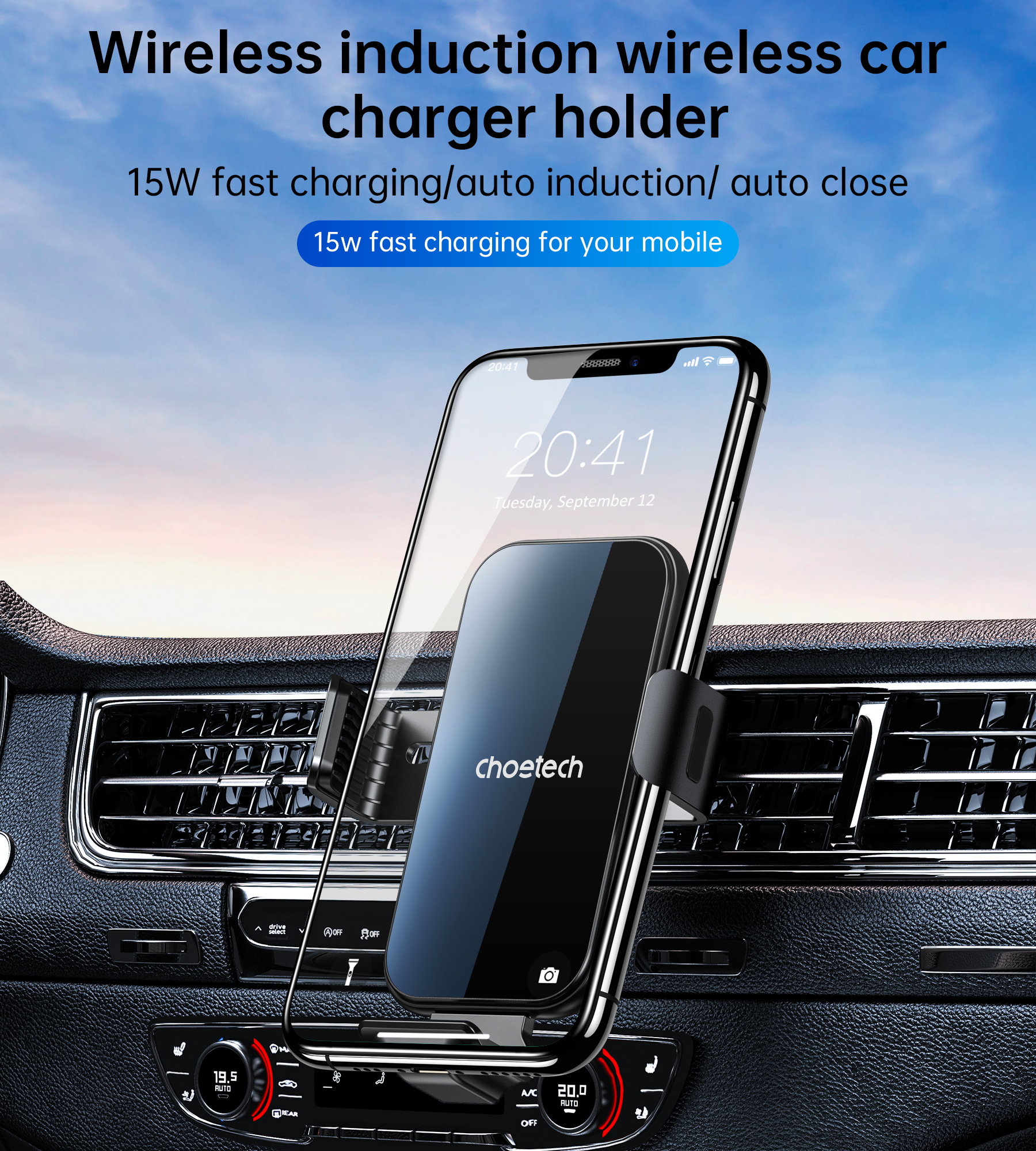 ✨Gía đỡ điện thoại Choetech T201 tích hợp sạc không dây trên ô tô 15w - Hàng chính hãng